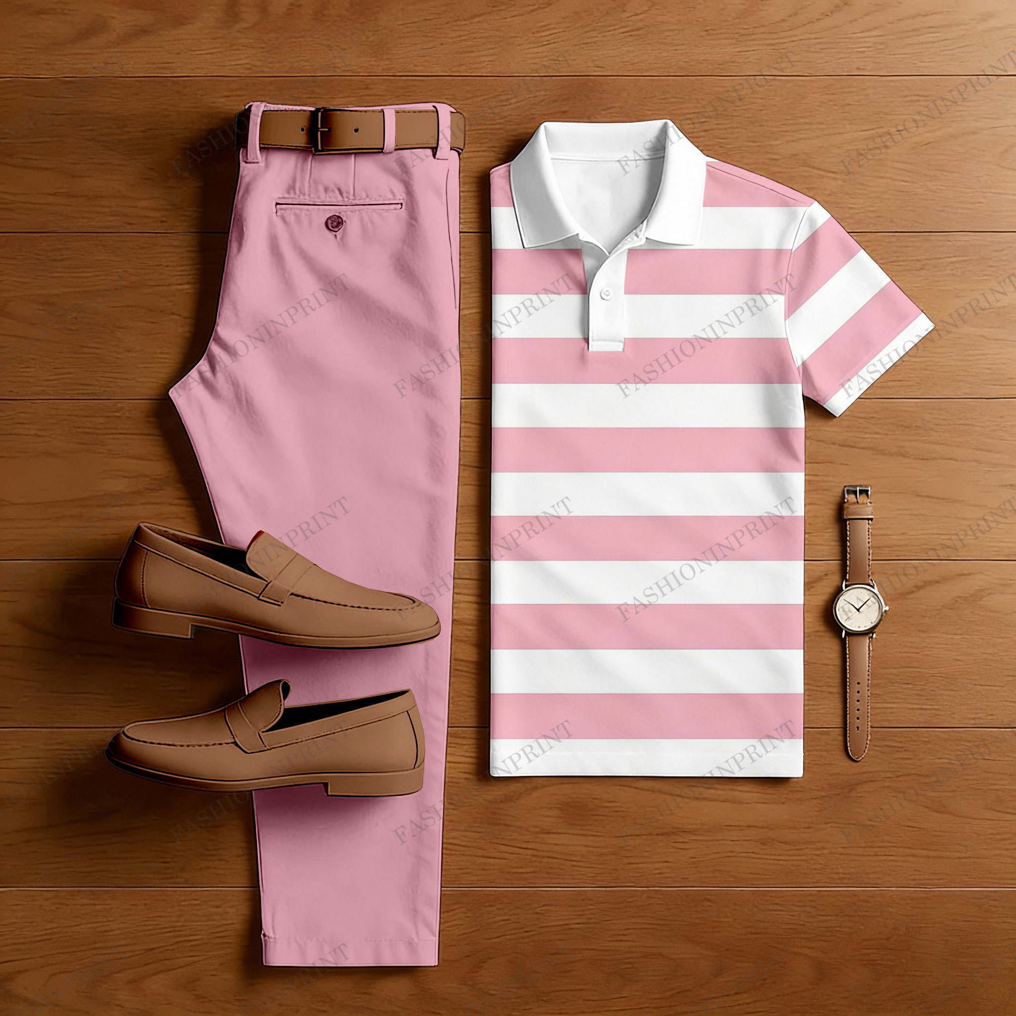 Men's Casual Pink & White Color Matching Striped Printed Short Sleeved Polo Shirt & Trousers Two-Piece Set