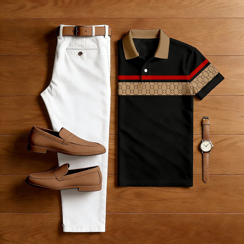 Men's Casual Black & Brown Color Matching Striped Retro Style Printed Short Sleeved Polo Shirt & White Trousers Two-Piece Set