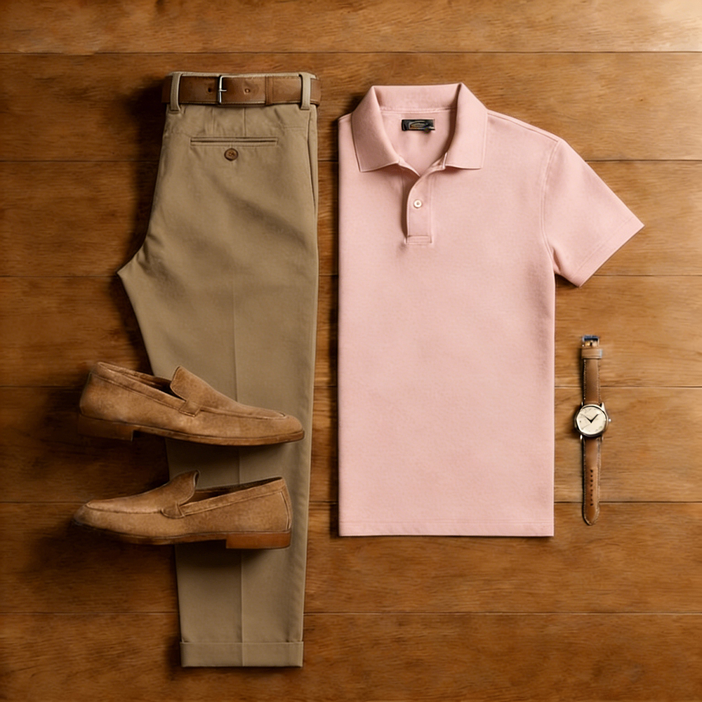 Men's Casual Brown & Pink Solid Color Matching Short Sleeved Polo Shirt & Trousers Two-Piece Set