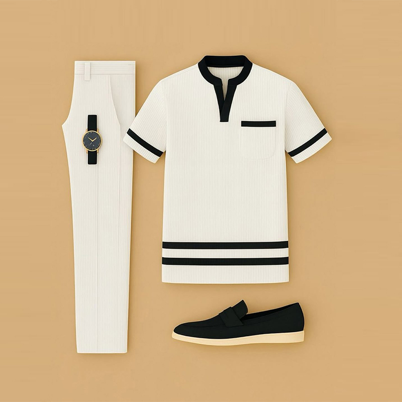 Men's Casual Beige & Black Color Matching Short Sleeved Henry Collar T-Shirt & Trousers Two-Piece Set