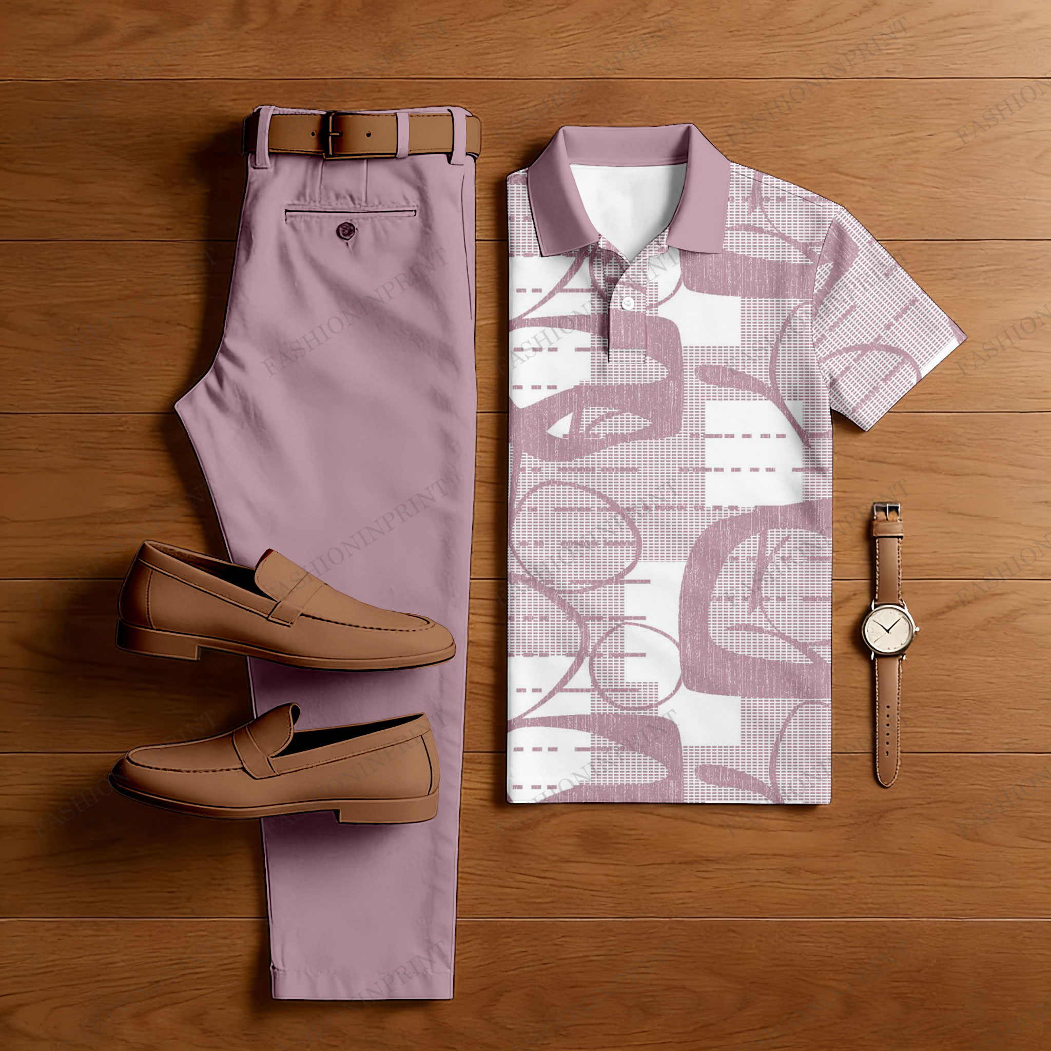 Men's Casual Pink & White Color Matching Retro Style Printed Short Sleeved Polo Shirt & Trousers Two-Piece Set
