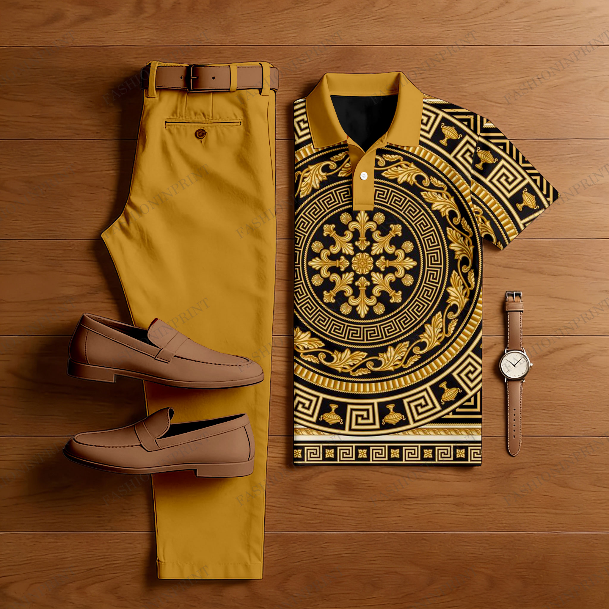 Men's Casual Ginger Yellow & Black Color Matching Baroque Style Printed Short Sleeved Polo Shirt & Trousers Two-Piece Set