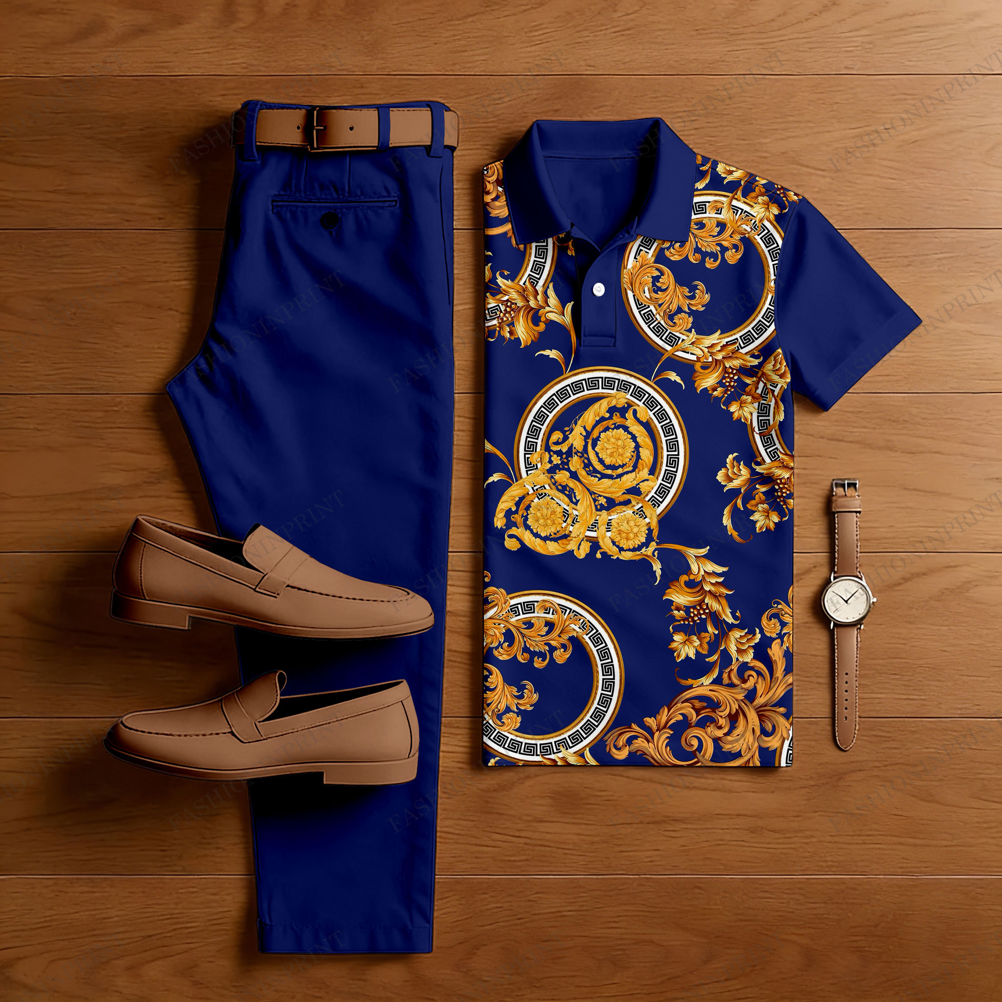 Men's Casual Royal Blue & Gold Color Matching Baroque Style Printed Short Sleeved Polo Shirt & Trousers Two-Piece Set