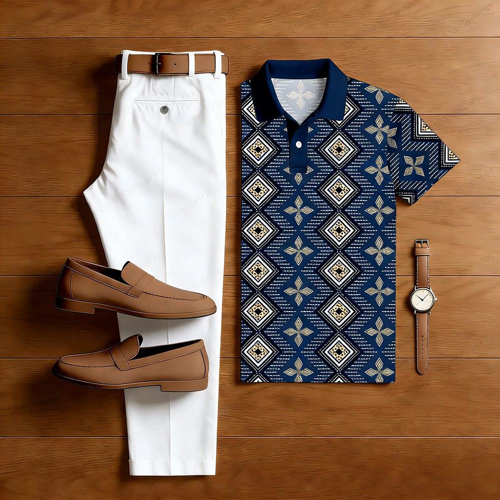 Men's Casual Navy Blue Color Matching Ethnic Style Printed Short Sleeved Polo Shirt & White Trousers Two-Piece Set