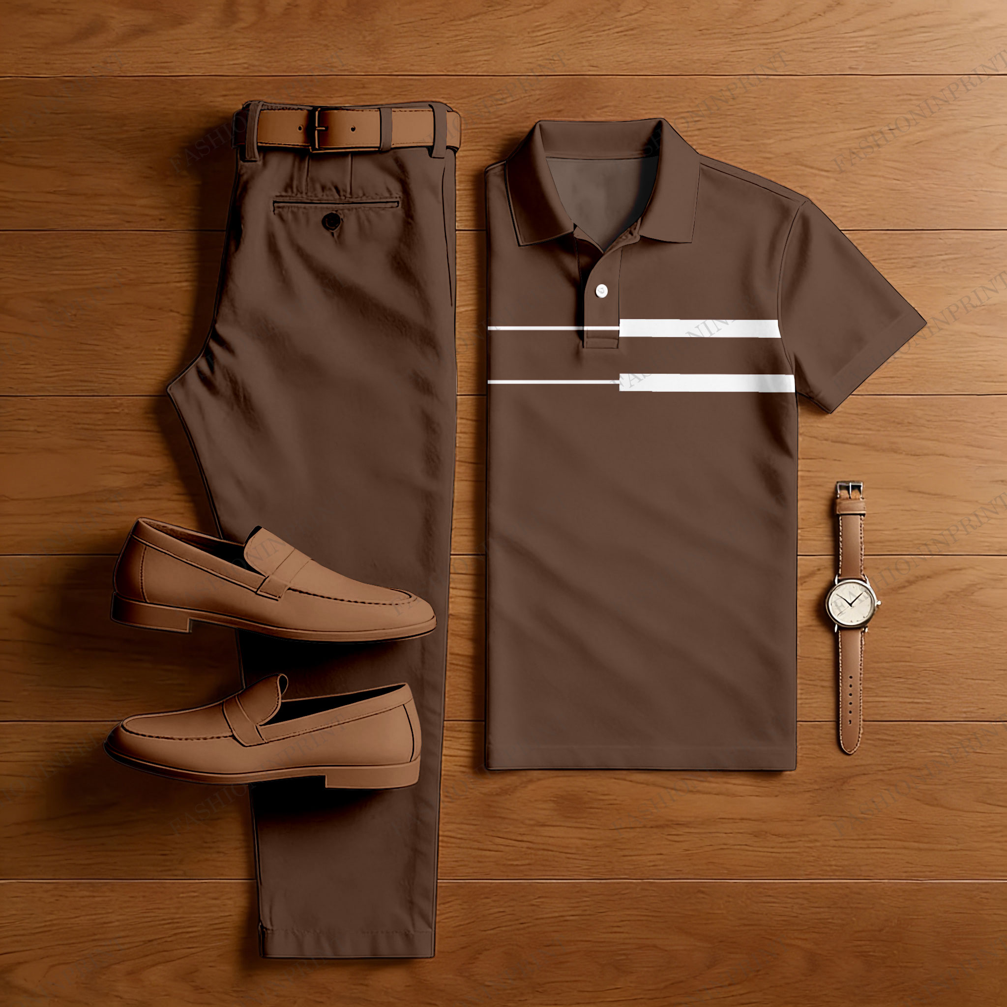 Men's Casual Dark Coffee & White Color Matching Striped Printed Short Sleeved Polo Shirt & Trousers Two-Piece Set