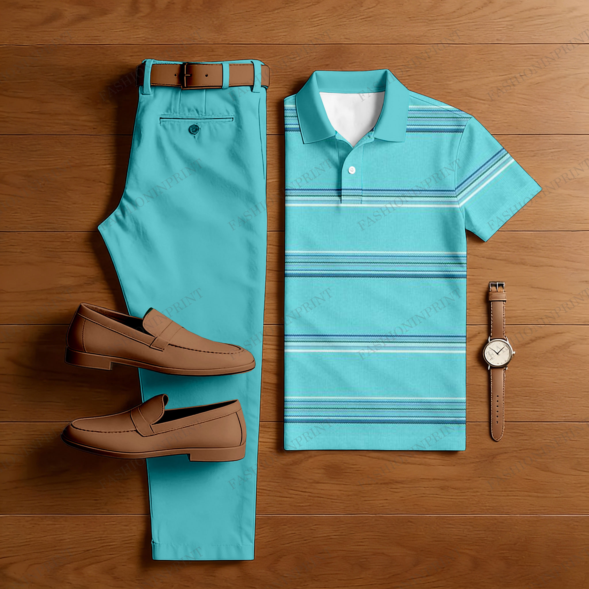 Men's Casual Lake Blue Color Matching Striped Printed Short Sleeved Polo Shirt & Trousers Two-Piece Set