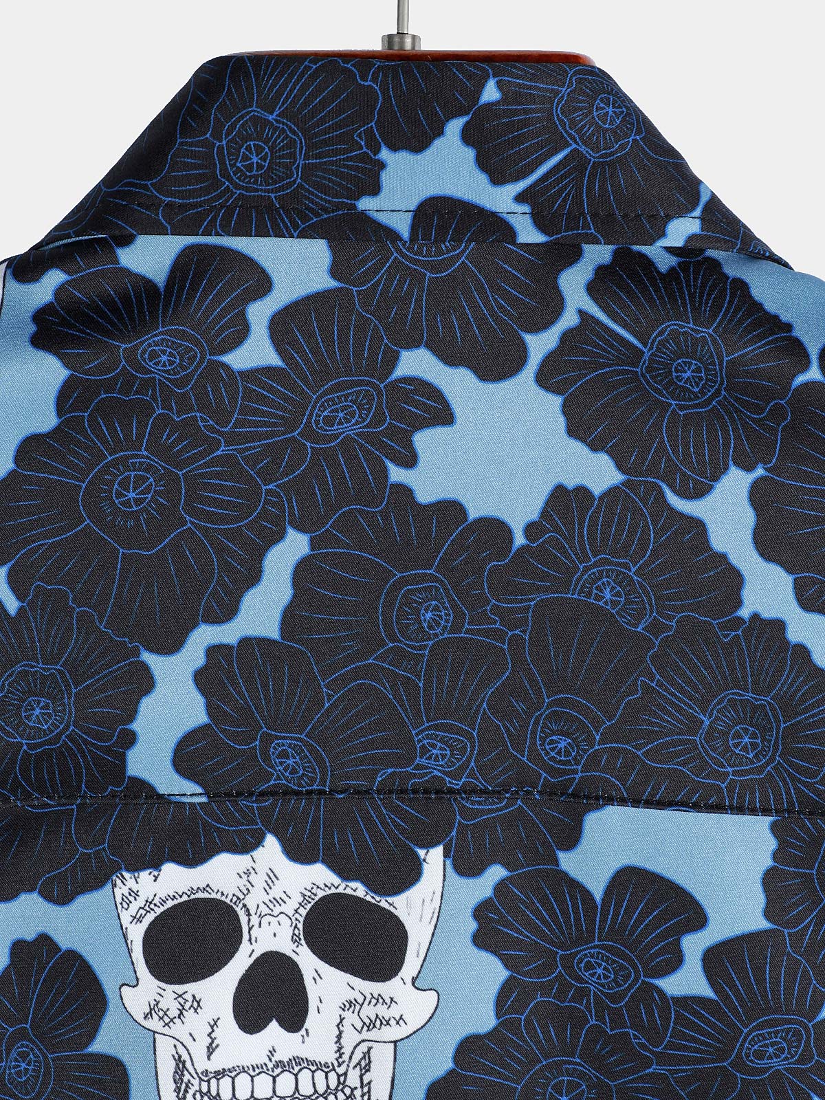 Men's Floral Print Cool Skull Casual Holiday Button Short Sleeve Shirt