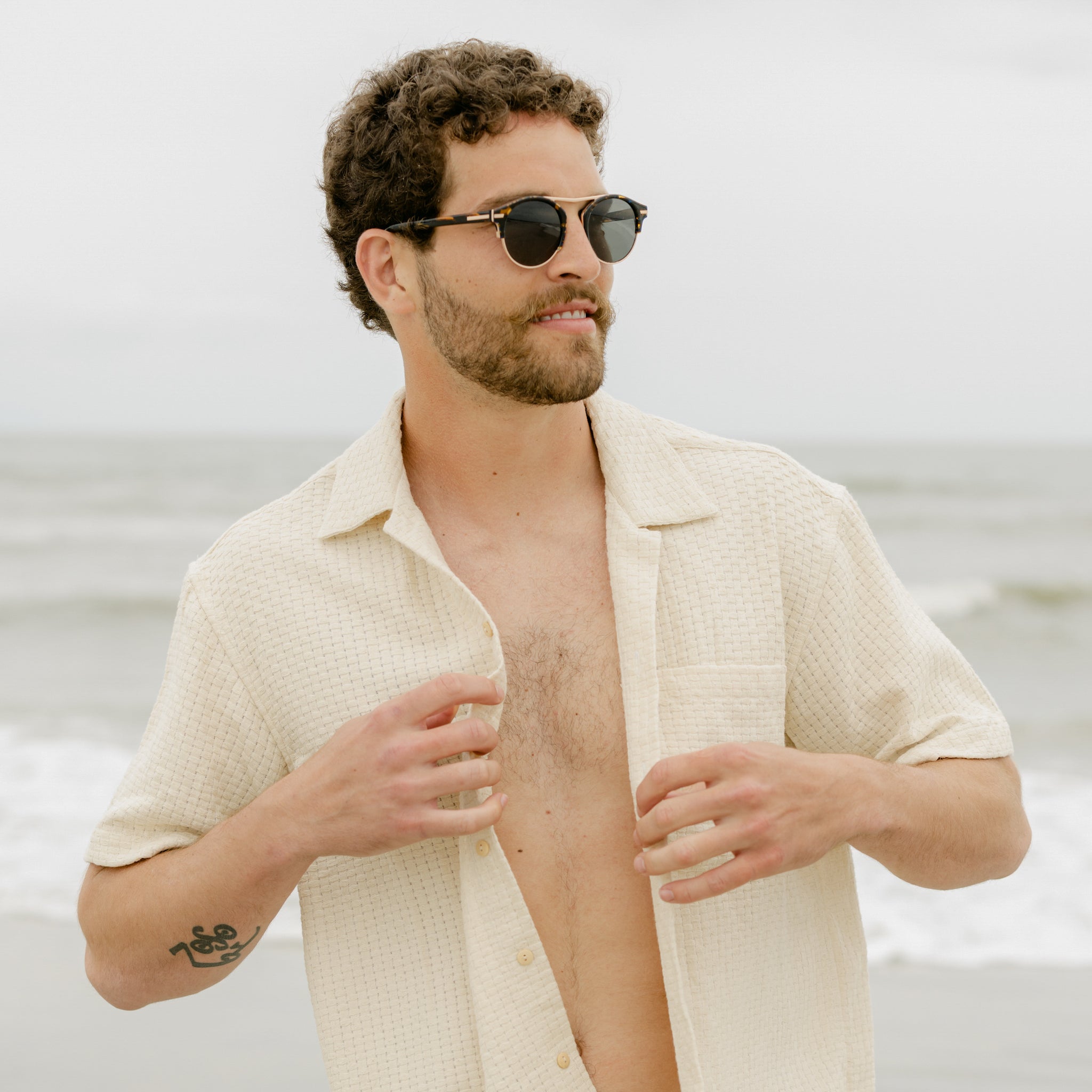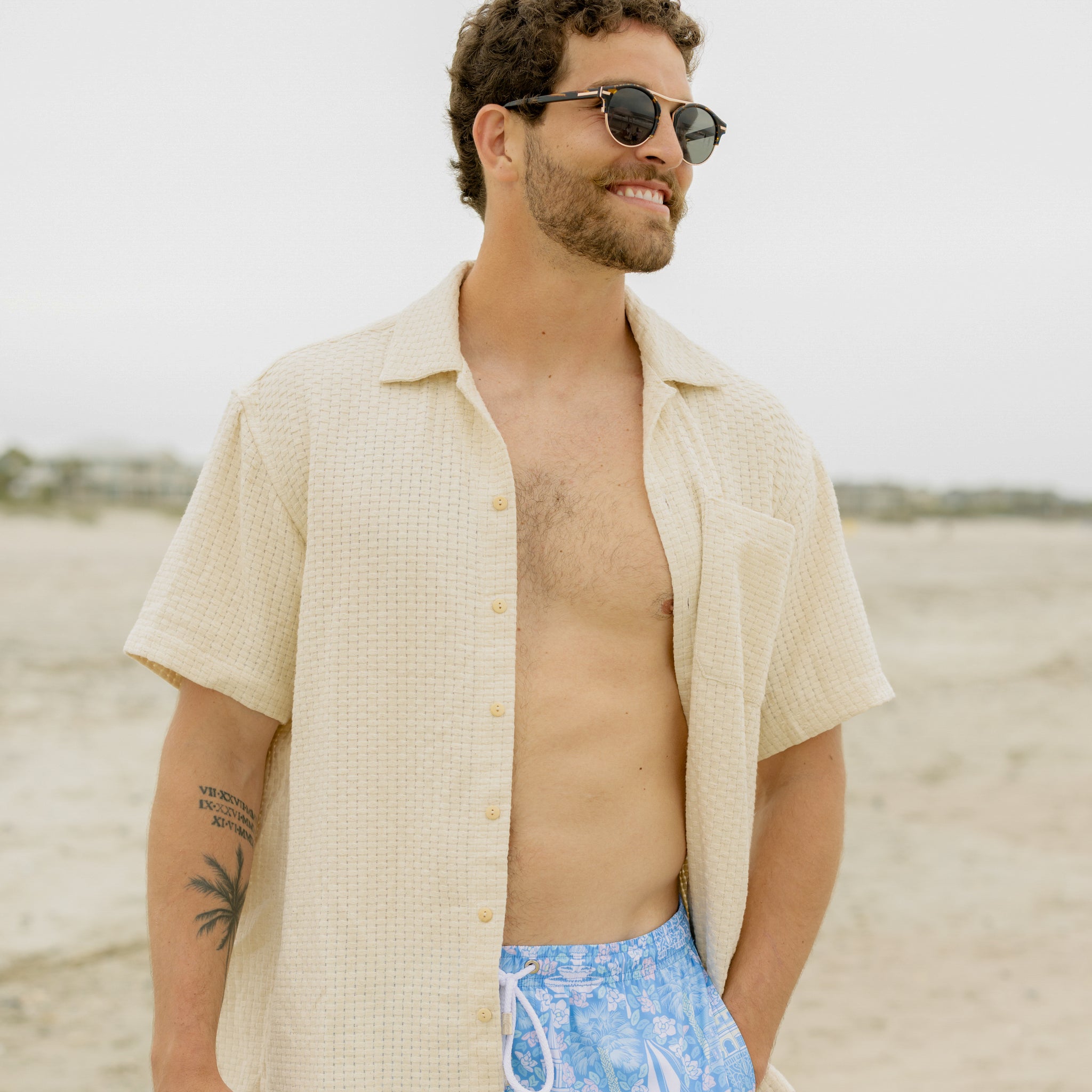 Designed for the guy weaving in and out of vacation, this natural sand-toned woven shirt blends in with the locals and stands out in the crowd. Our new breezy textured shirt comes equipped with a vintage camp collar, our signature Coconuttons ™ and the stealth Sunglass Loop ™ so you’re ready for whatever adventure you find yourself on this summer.