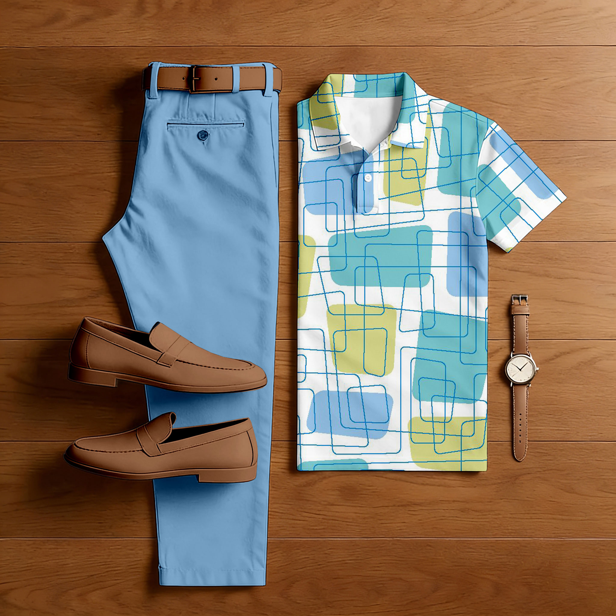 Men's Casual Blue & Multi Color Matching Geometric Printed Short Sleeved Polo Shirt & Trousers Two-Piece Set