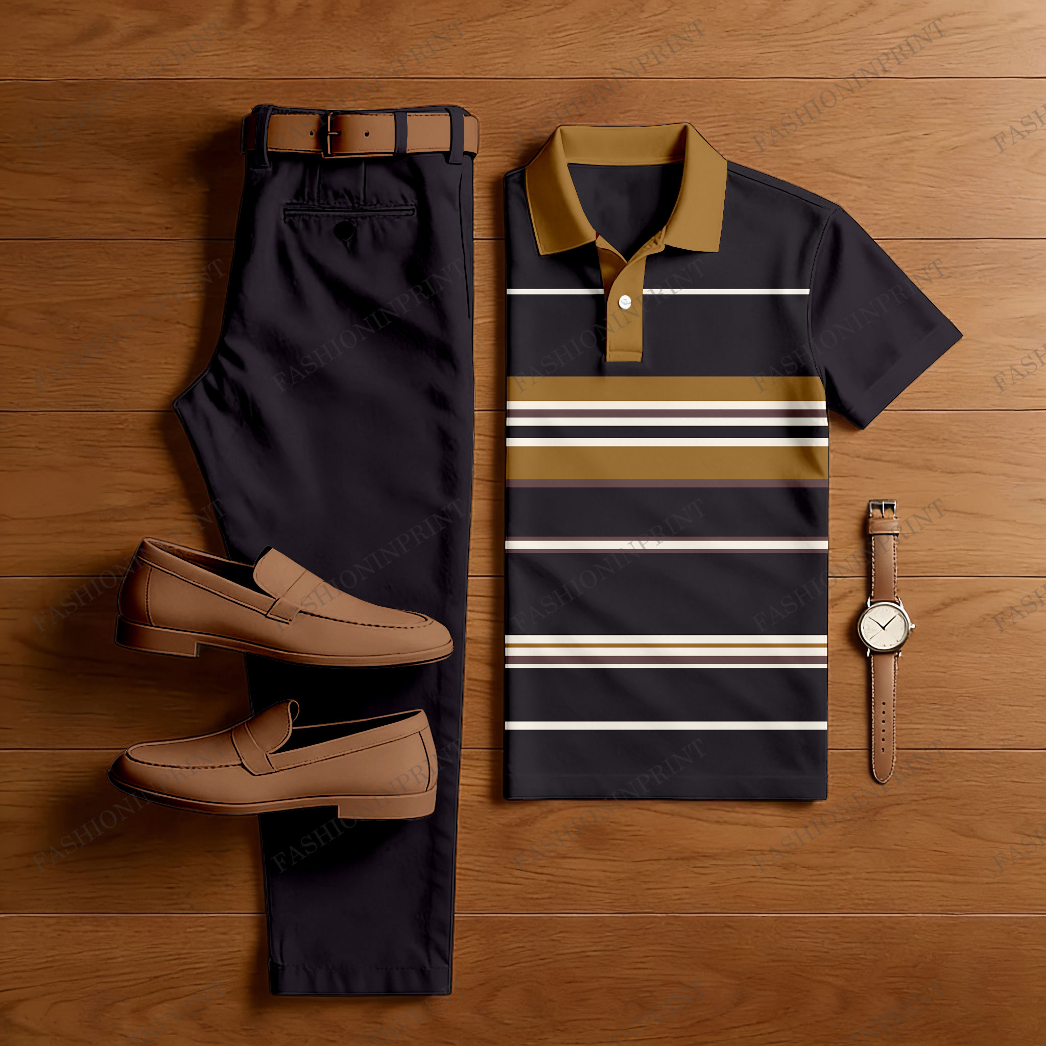 Men's Casual Black & Ginger Color Matching Striped Printed Short Sleeved Polo Shirt & Trousers Two-Piece Set