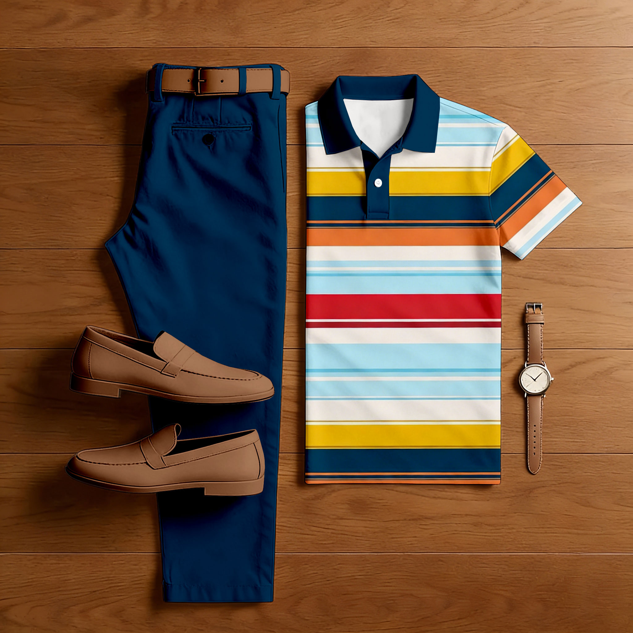 Men's Casual Royal Blue & Multi Color Matching Striped Printed Short Sleeved Polo Shirt & Trousers Two-Piece Set