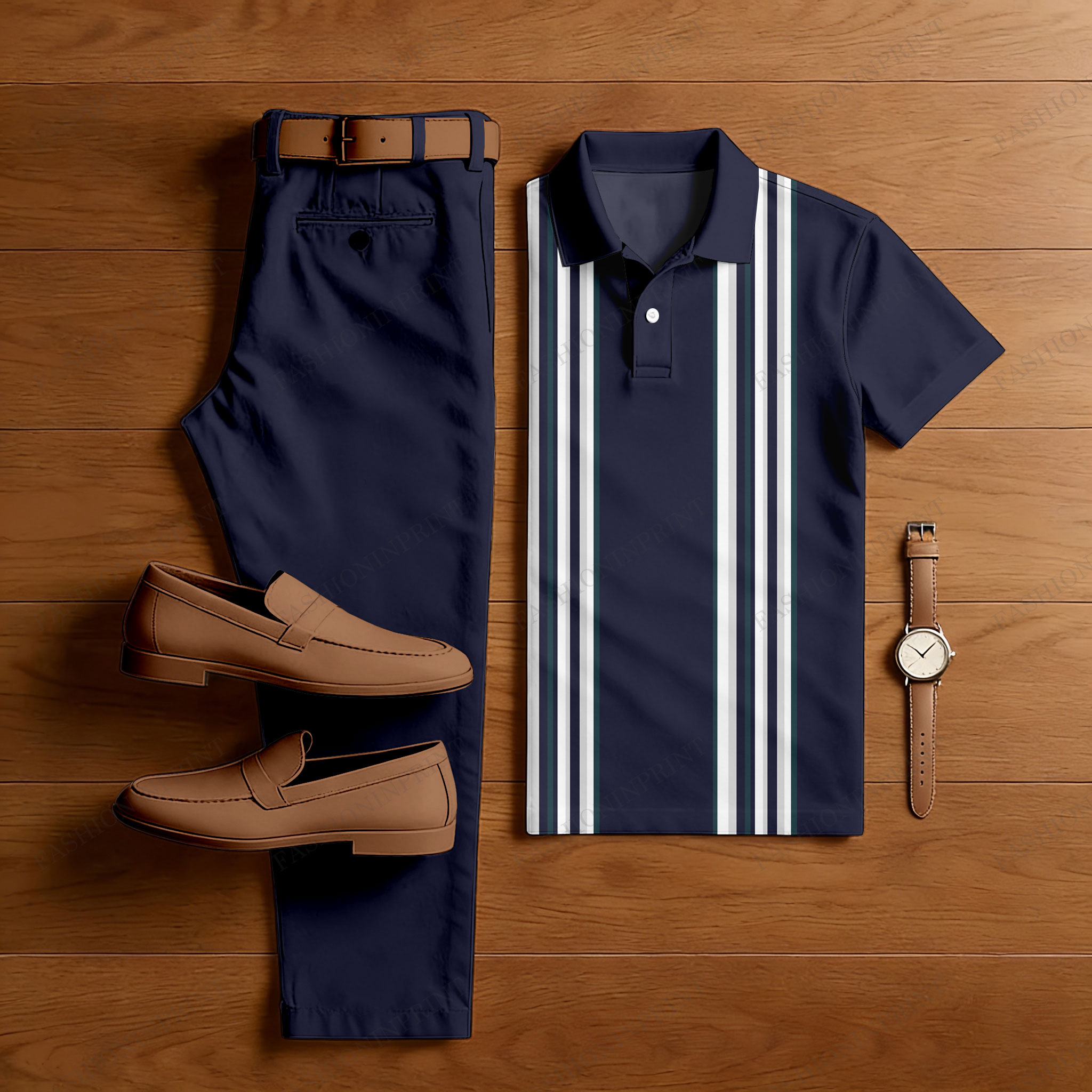 Men's Navy Blue & White Casual Color Matching Striped Printed Short Sleeved Polo Shirt & Trousers Two-Piece Set