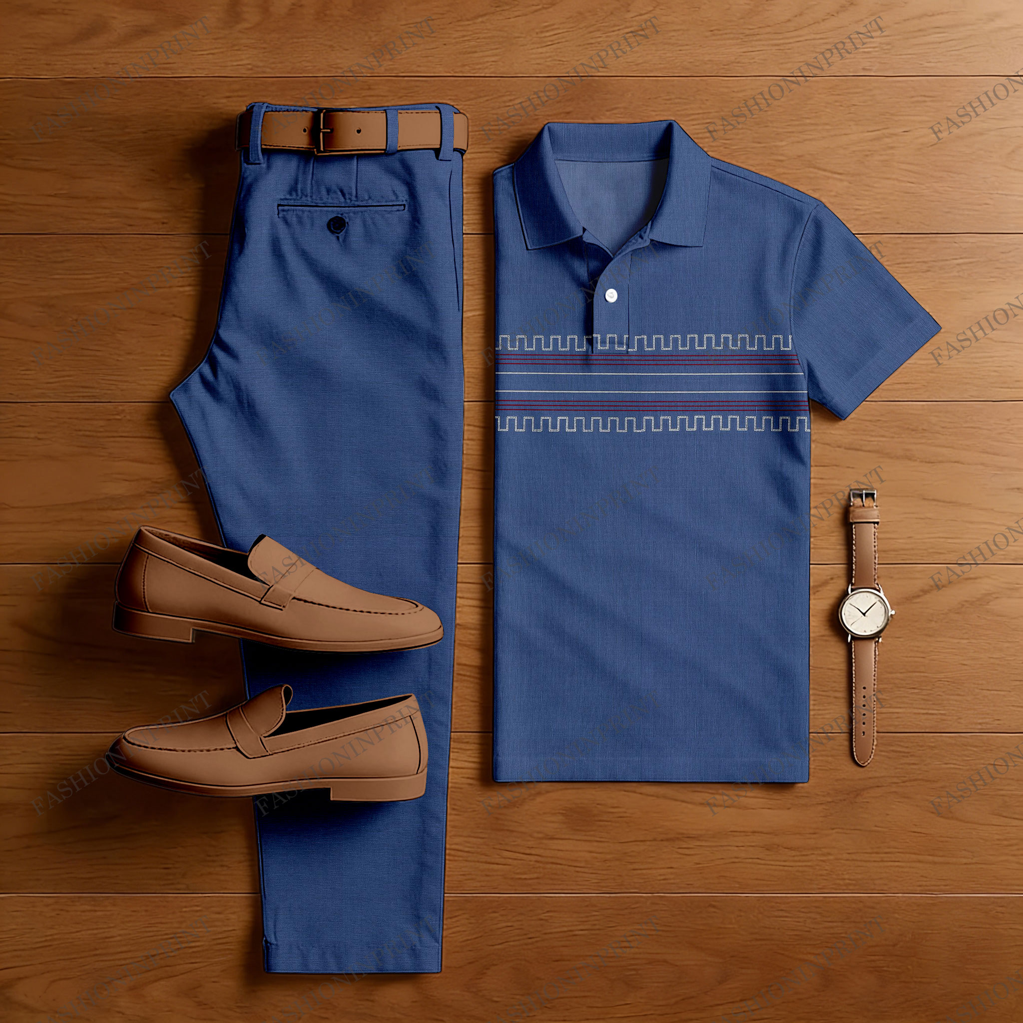 Men's Casual Navy Blue Color Matching Striped Printed Short Sleeved Polo Shirt & Trousers Two-Piece Set
