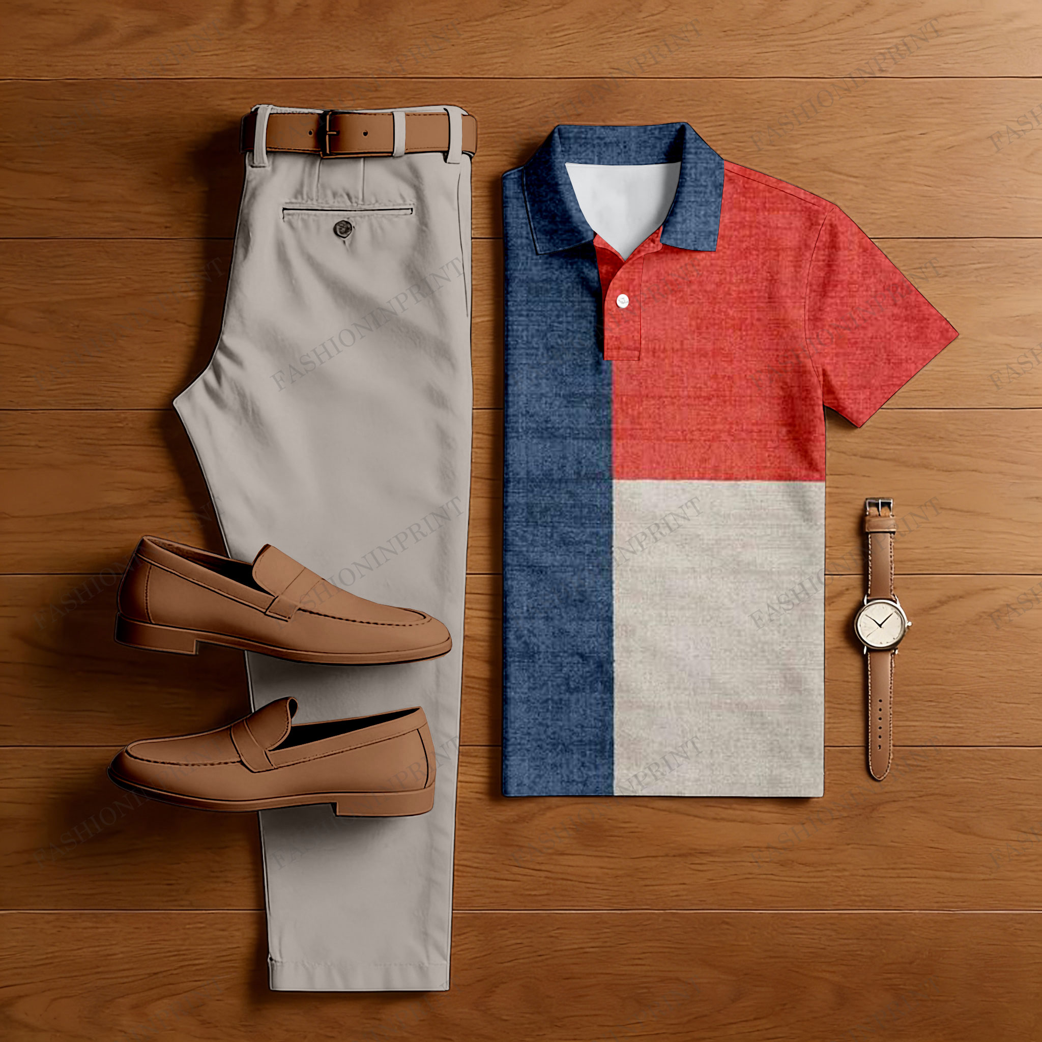 Men's Casual Khaki Gray & Navy & Red Color Matching Printed Short Sleeved Polo Shirt & Trousers Two-Piece Set