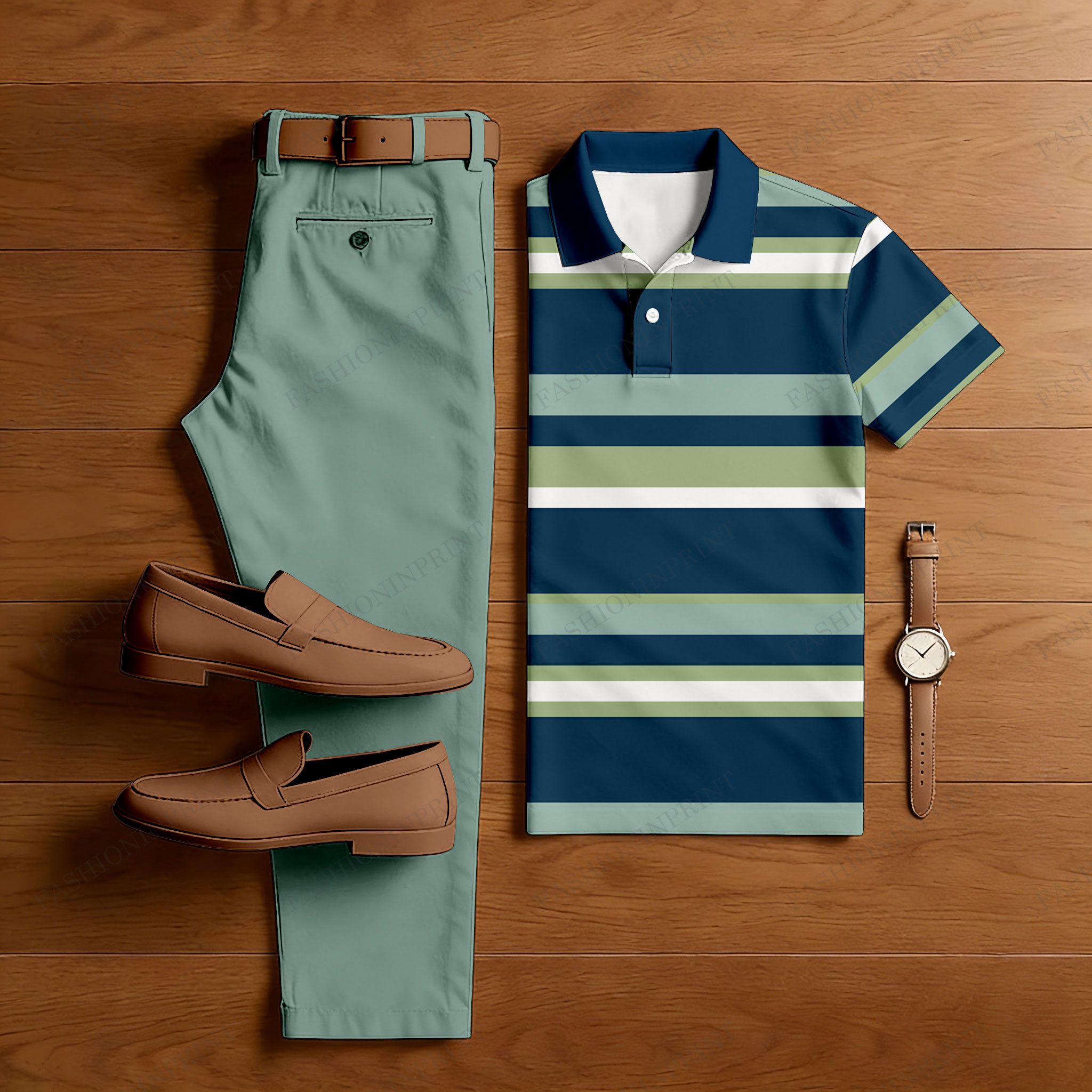 Men's Casual Navy Blue & Green Color Matching Striped Printed Short Sleeved Polo Shirt & Trousers Two-Piece Set