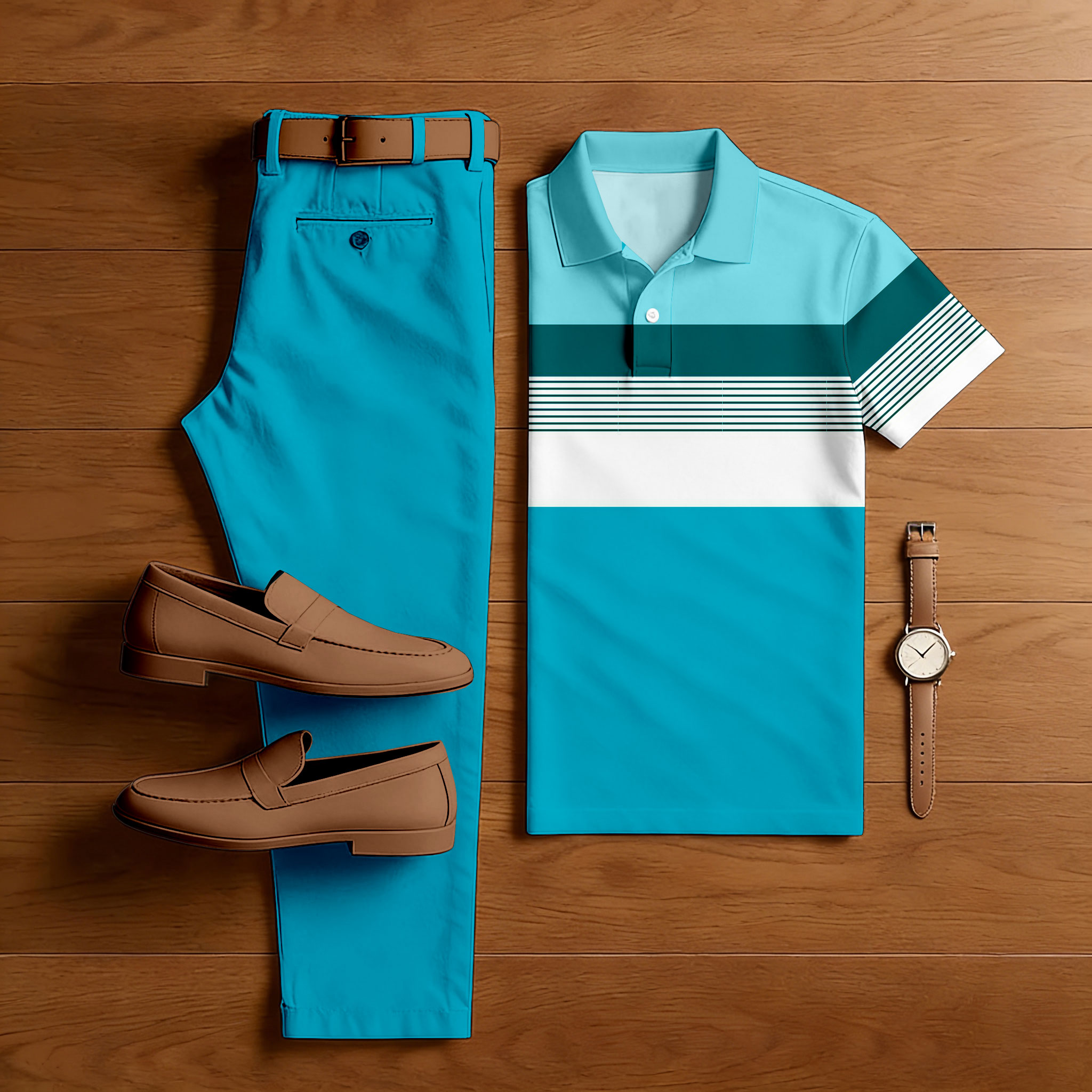 Men's Casual Blue & White Color Matching Striped Printed Short Sleeved Polo Shirt & Trousers Two-Piece Set
