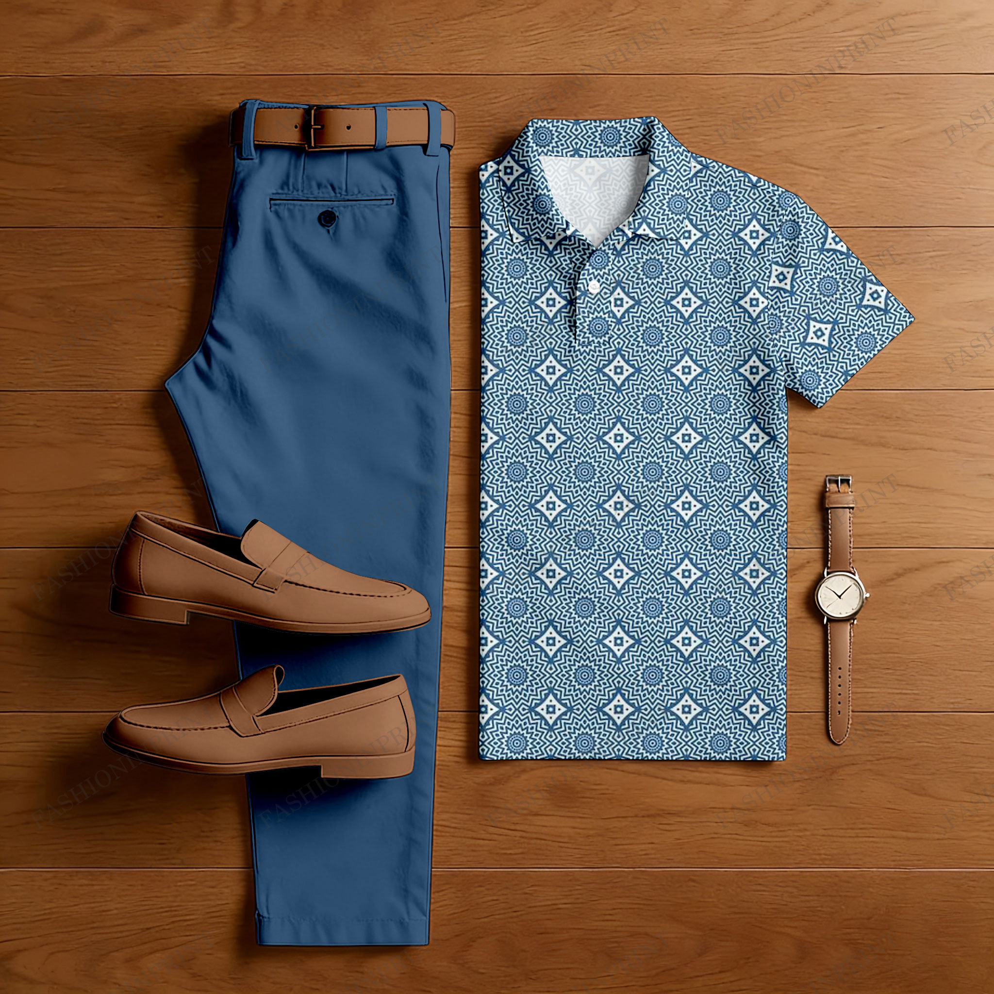 Men's Casual Blue & White Color Matching Ethnic Style Printed Short Sleeved Polo Shirt & Trousers Two-Piece Set