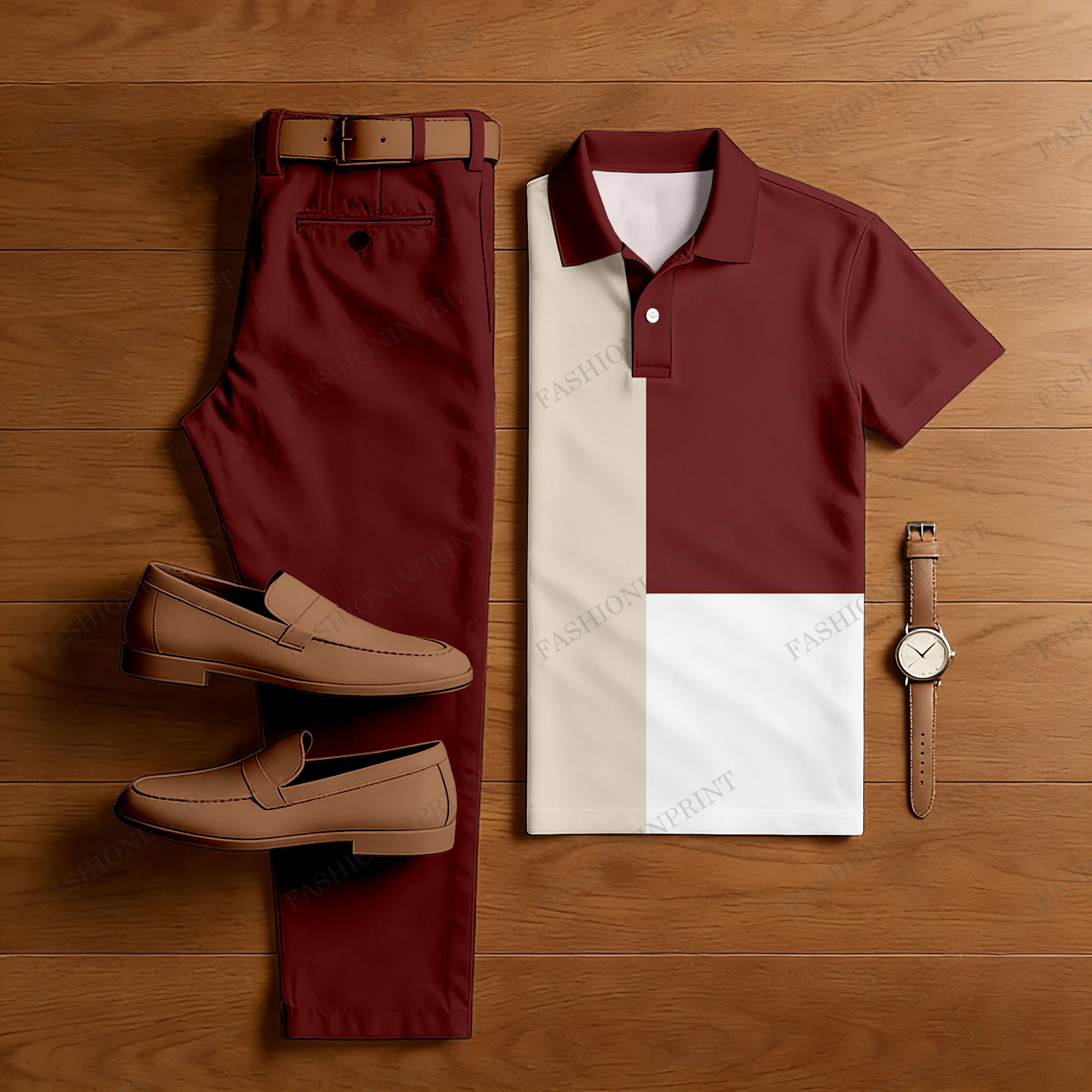 Men's Casual Burgundy & Apricot & White Color Matching Printed Short Sleeved Polo Shirt & Trousers Two-Piece Set