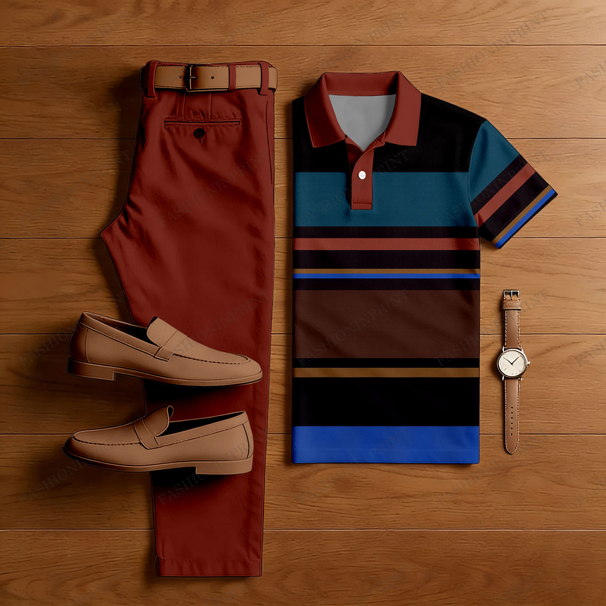 Men's Casual Red Brown & Multi Color Matching Striped Printed Short Sleeved Polo Shirt & Trousers Two-Piece Set