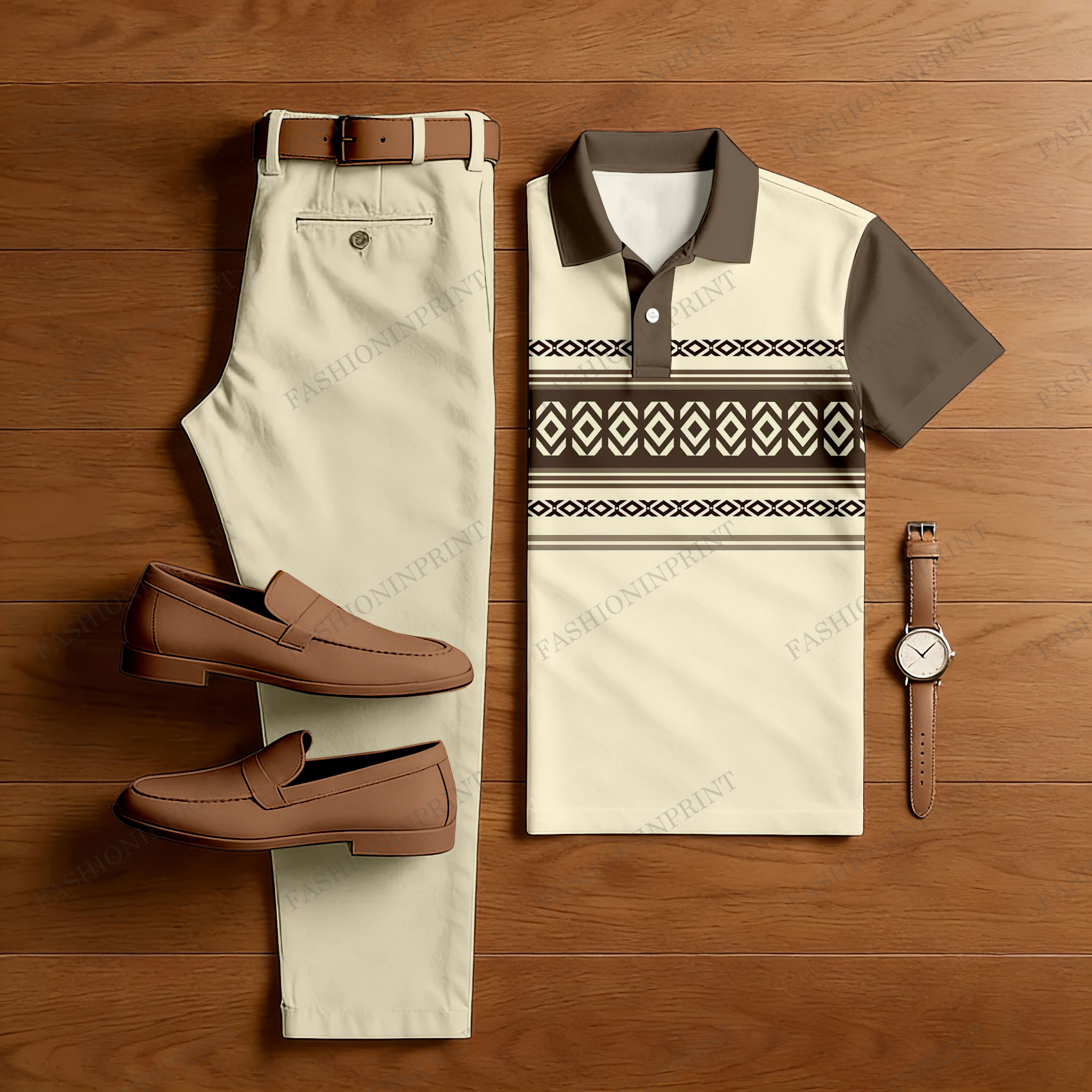 Men's Casual Light Yellow & Brown Color Matching Ethnic Style Printed Short Sleeved Polo Shirt & Trousers Two-Piece Set