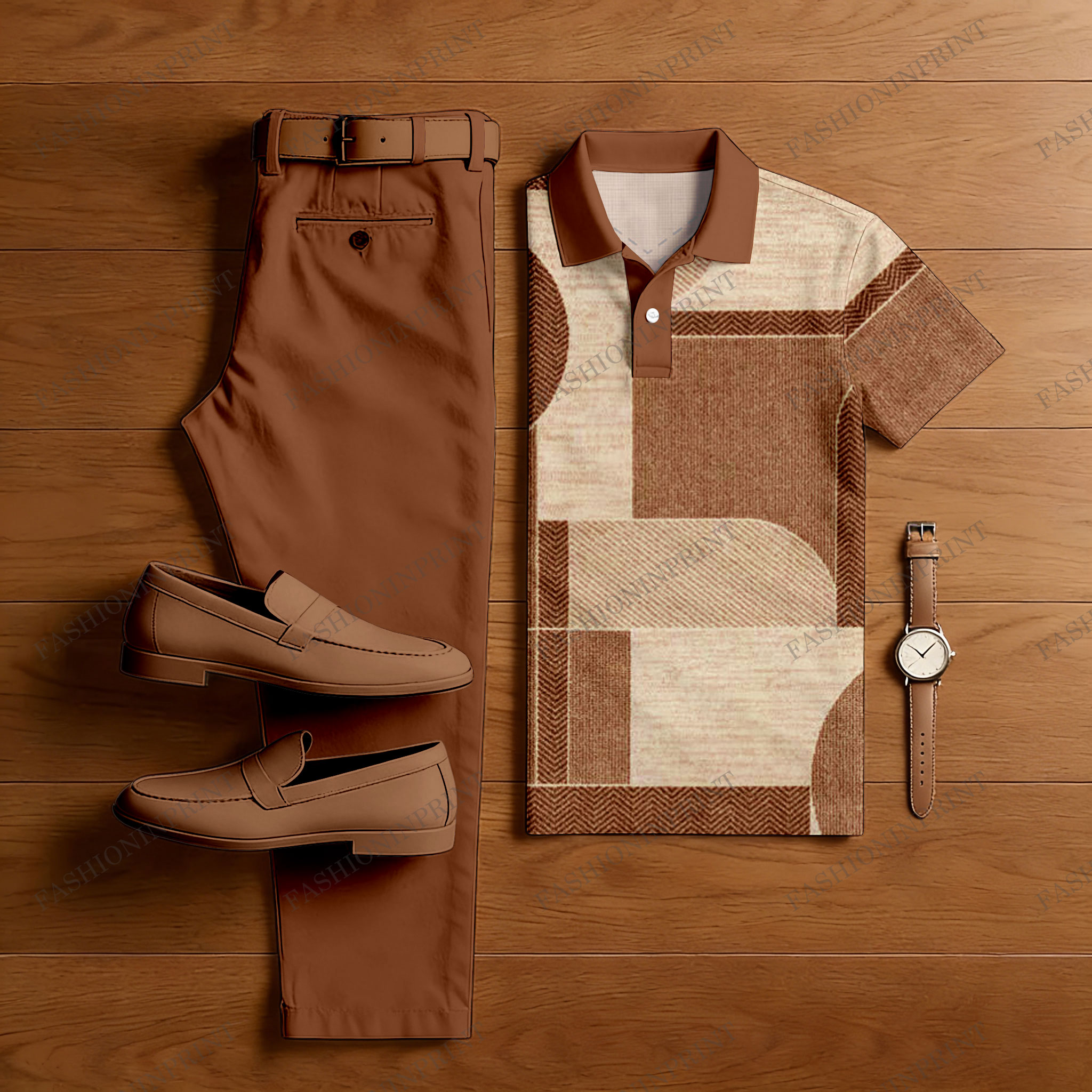 Men's Casual Orange & Khaki Color Matching Geometric Printed Short Sleeved Polo Shirt & Trousers Two-Piece Set