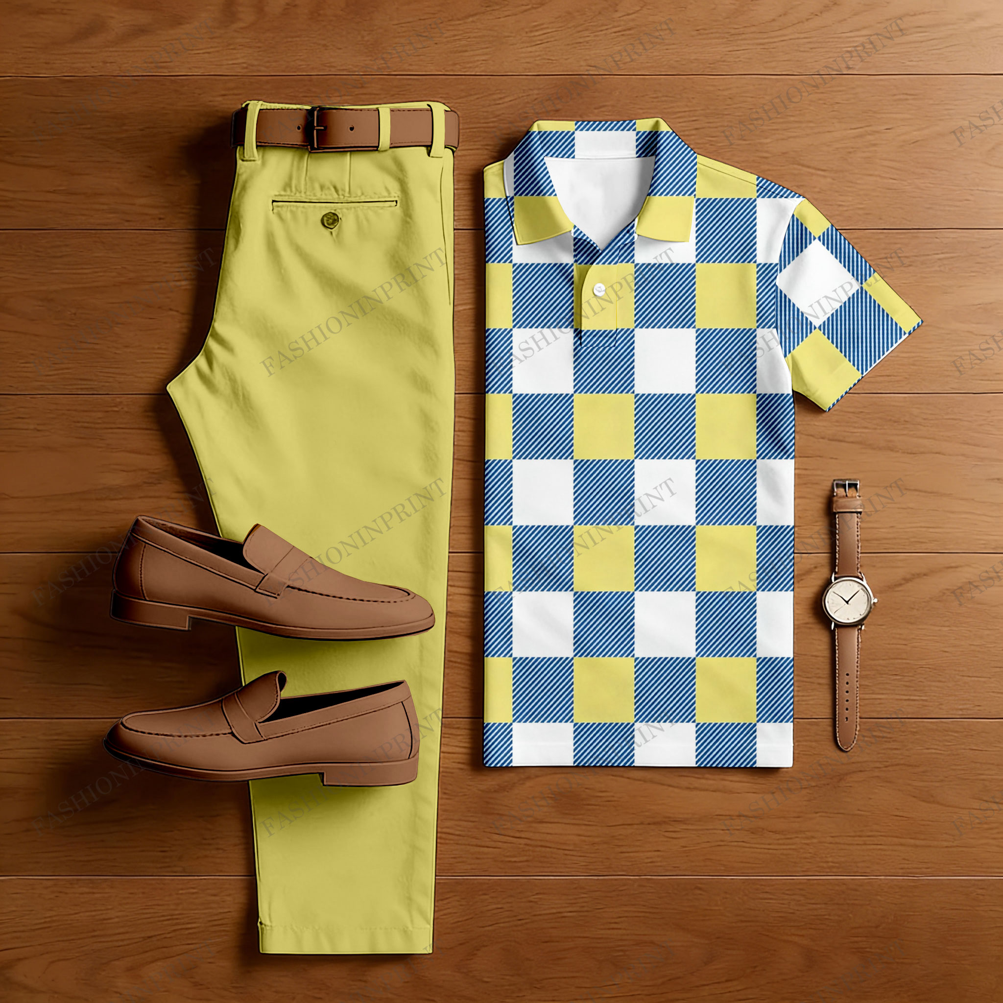 Men's Casual Yellow & Blue & White Color Matching Checkered Printed Short Sleeved Polo Shirt & Trousers Two-Piece Set