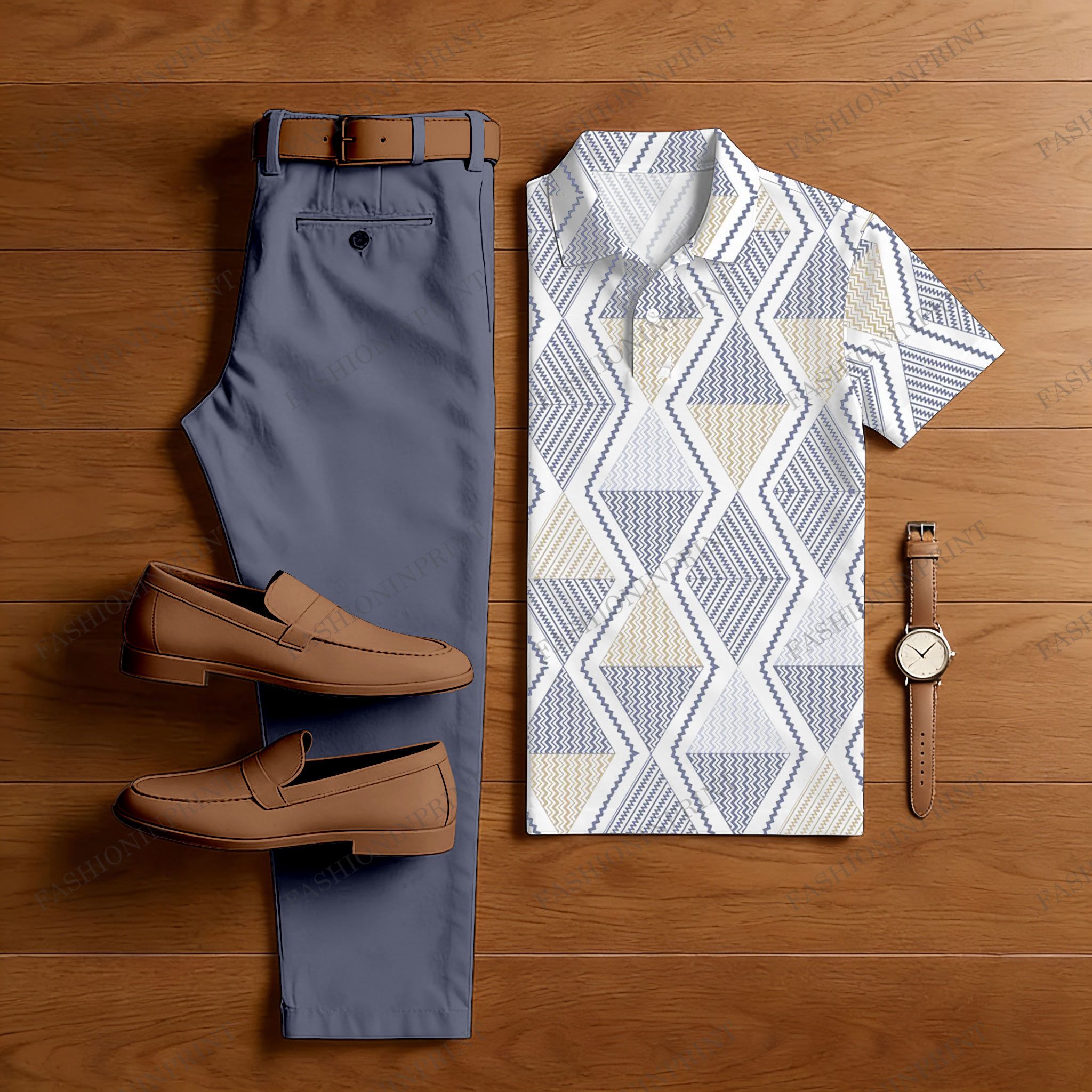 Men's Casual Purple & White Color Matching Retro Style Printed Short Sleeved Polo Shirt & Trousers Two-Piece Set