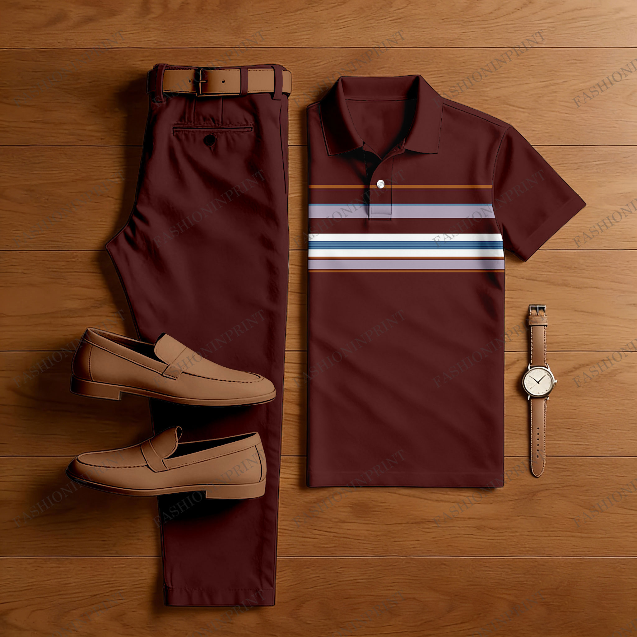 Men's Casual Maroon Color Matching Striped Printed Short Sleeved Polo Shirt & Trousers Two-Piece Set