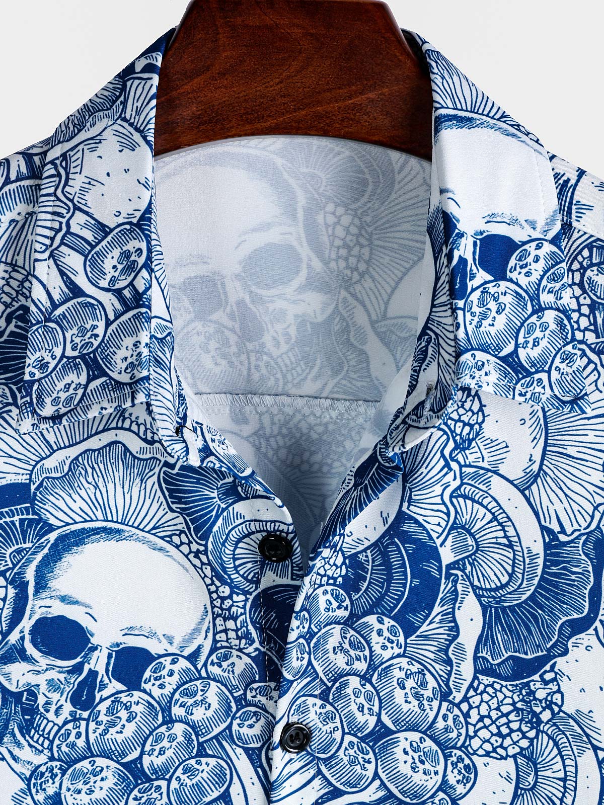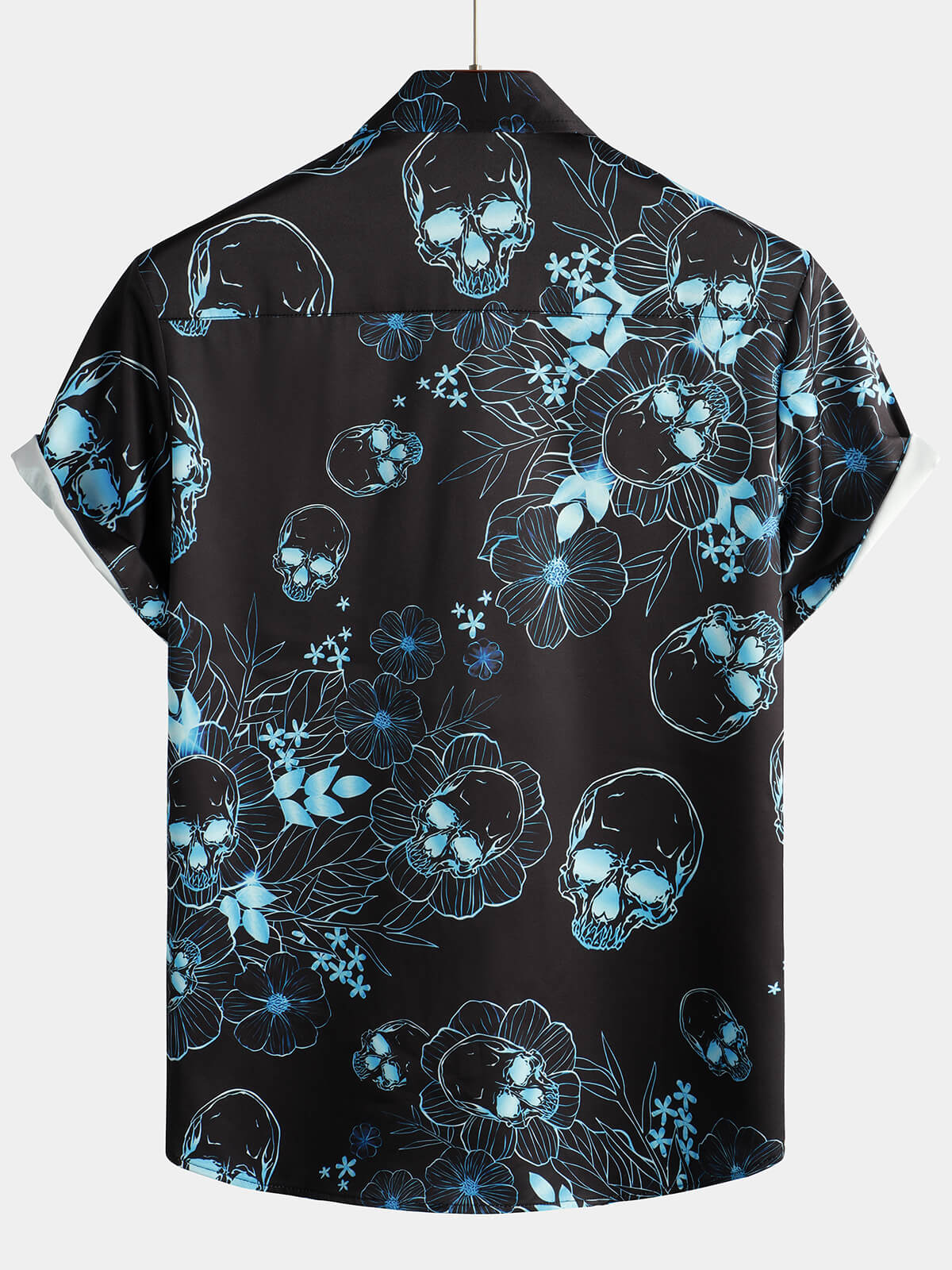 Men's Casual Blue Floral Skull Print Cool Button Short Sleeve Shirt