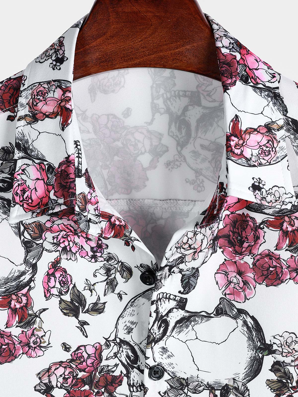 Men's Floral Skull Cool Graphic Button Up Short Sleeve Punk Rock Art Shirt