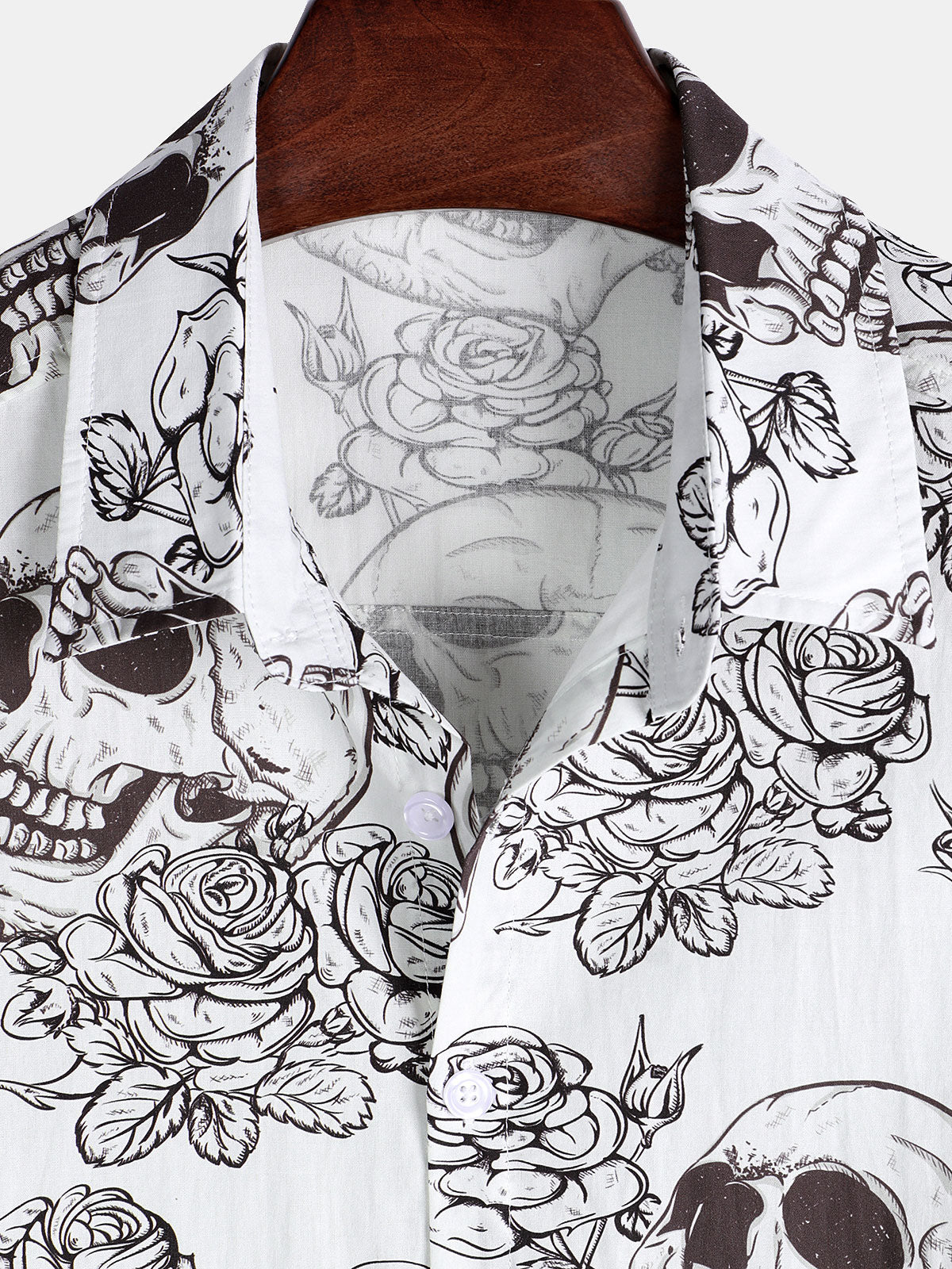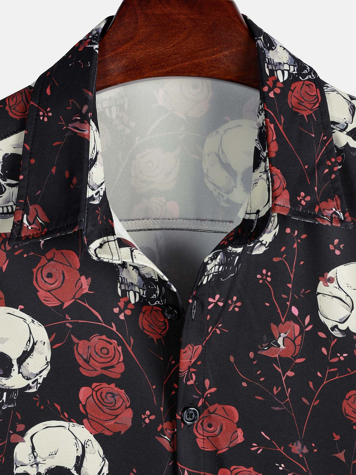 Men's Skull Rose Floral Punk Rocker Cool Rock Music Short Sleeve Hawaiian Shirt