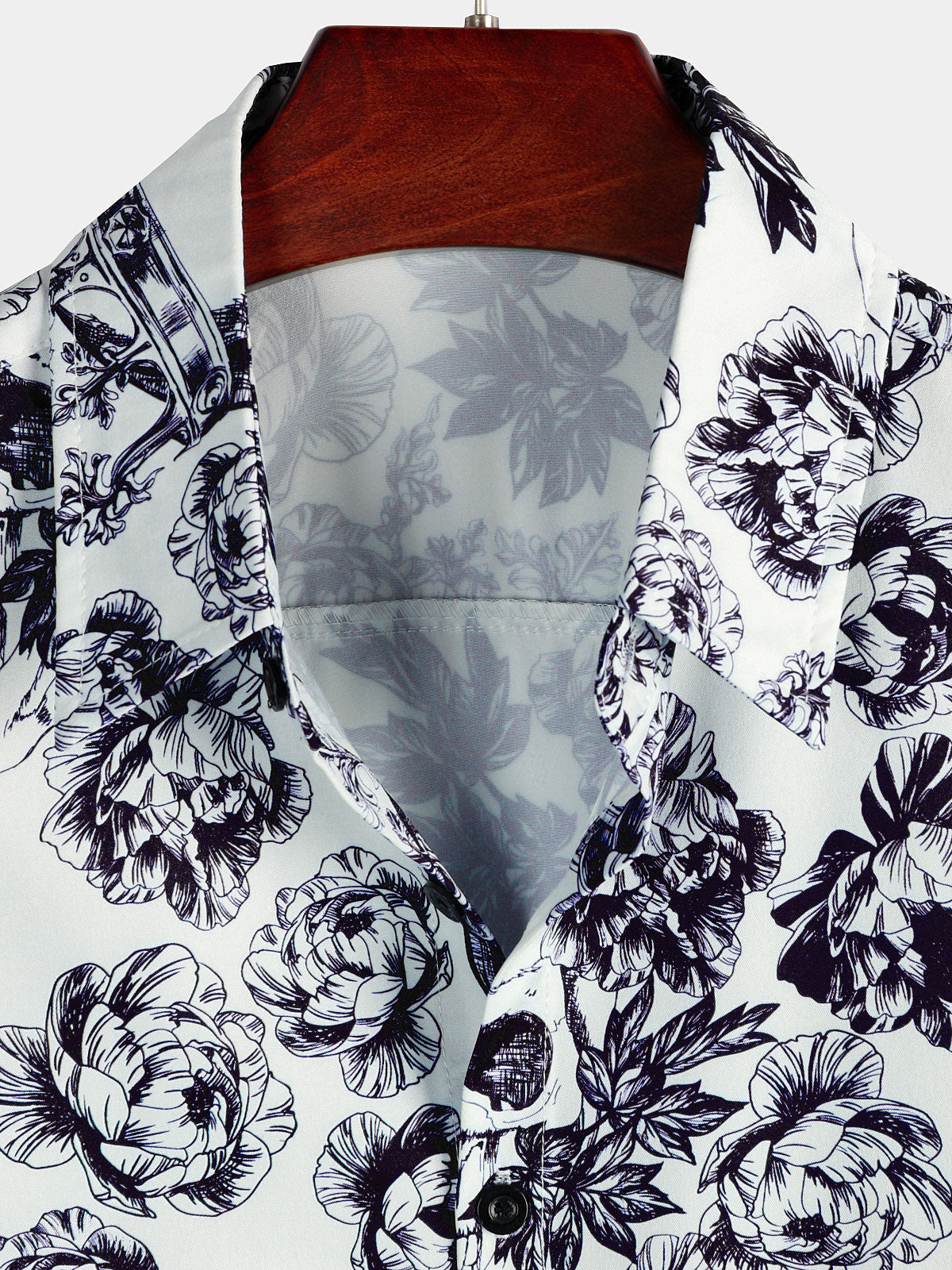 Men's Floral Print Cool Skull Vacation Button Short Sleeve Shirt