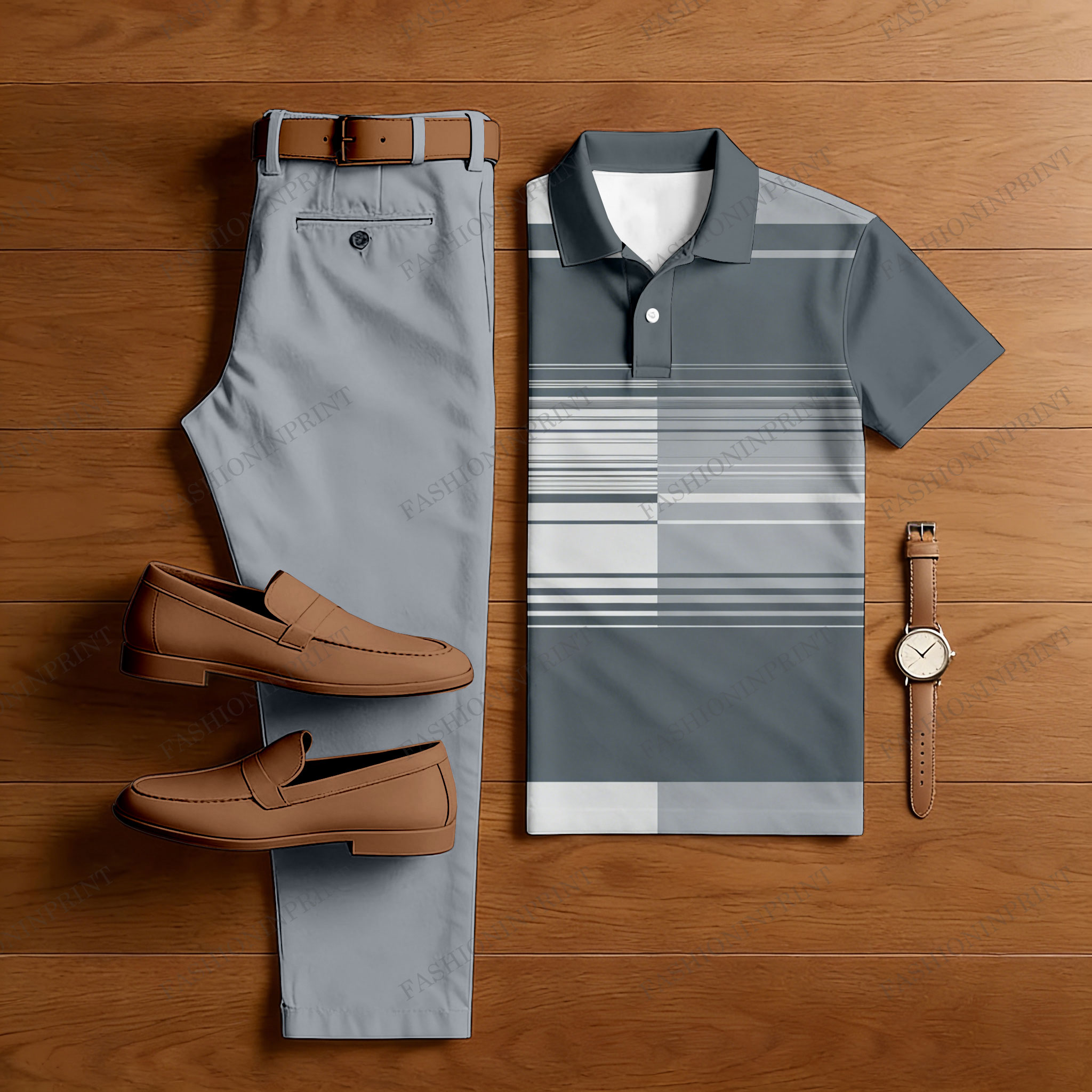 Men's Casual Gray Geometric Printed Short Sleeved Polo Shirt & Trousers Two-Piece Set
