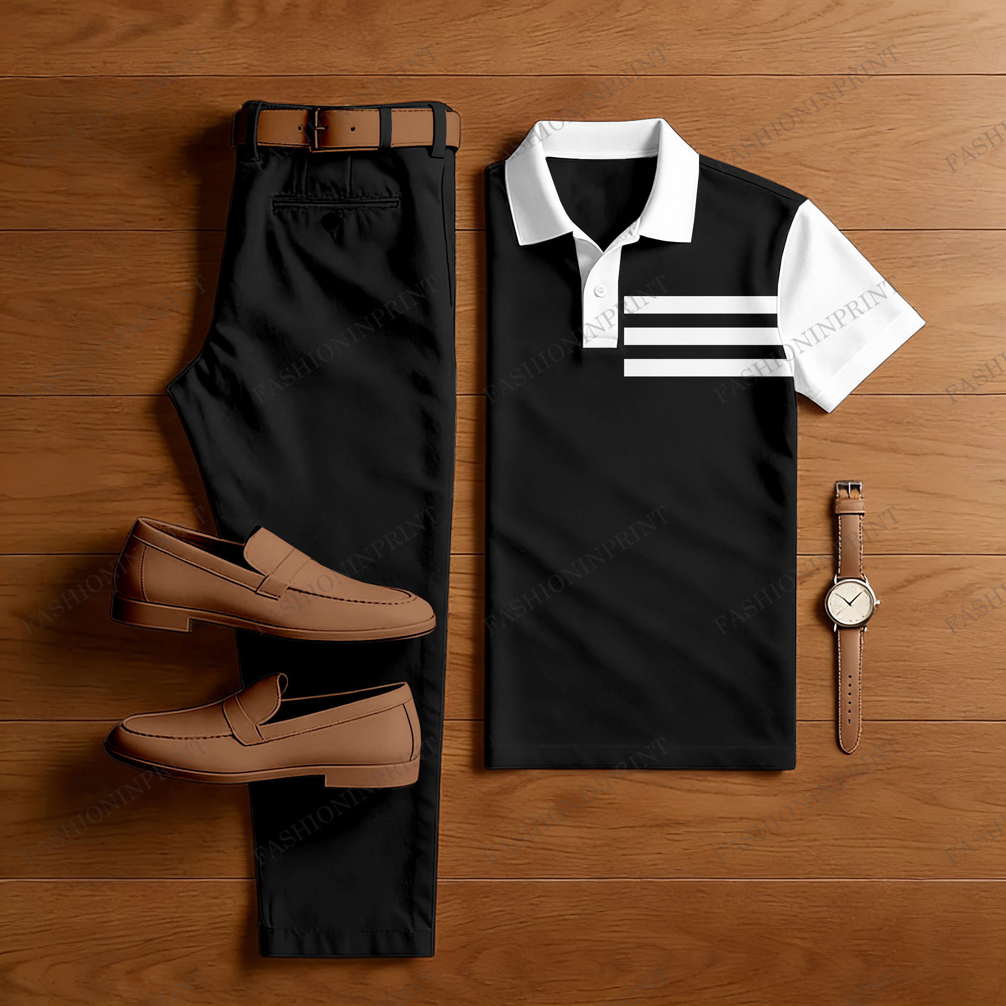 Men's Casual Black & White Color Matching Striped Printed Short Sleeved Polo Shirt & Trousers Two-Piece Set