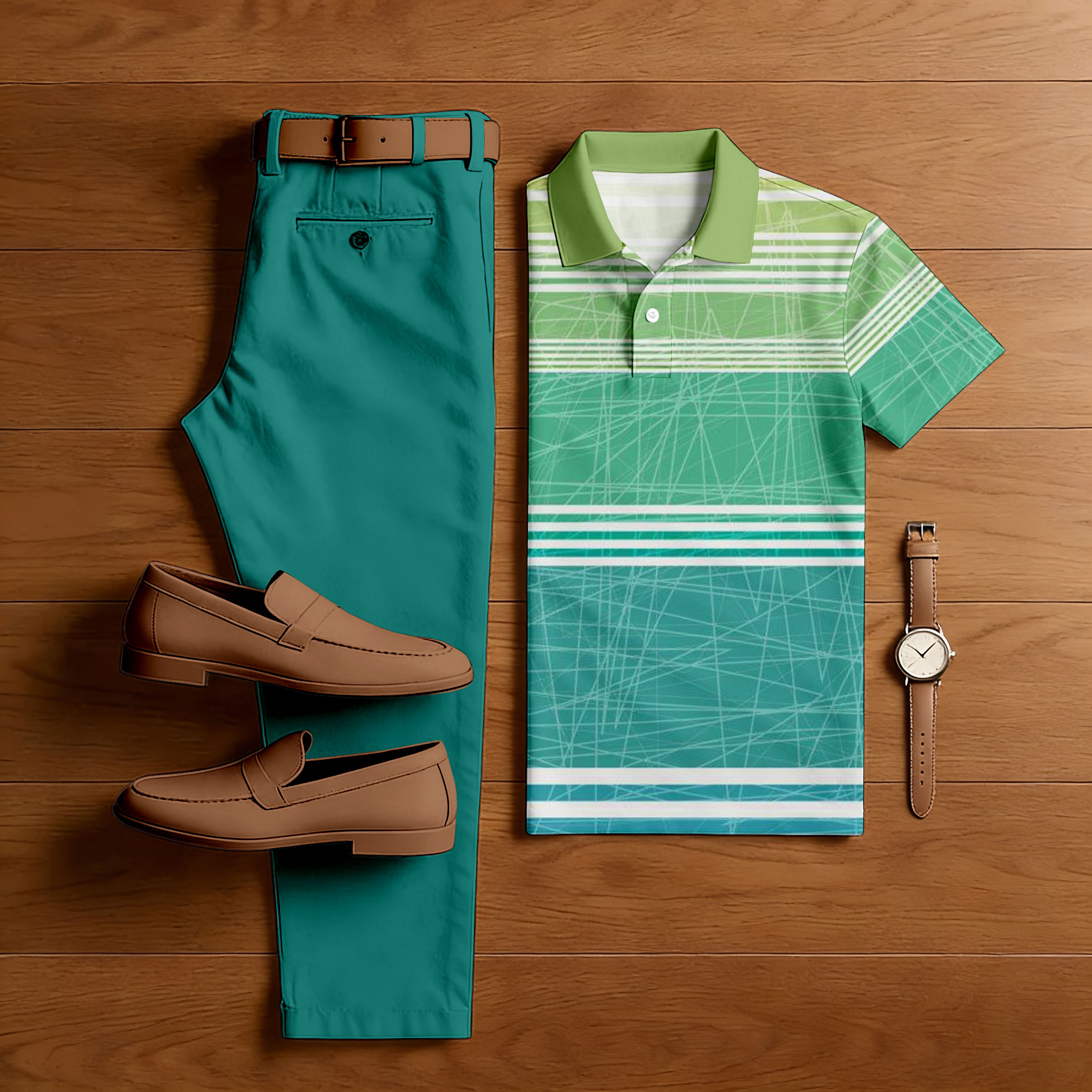 Men's Casual Green Color Matching Gradient Striped Printed Short Sleeved Polo Shirt & Trousers Two-Piece Set