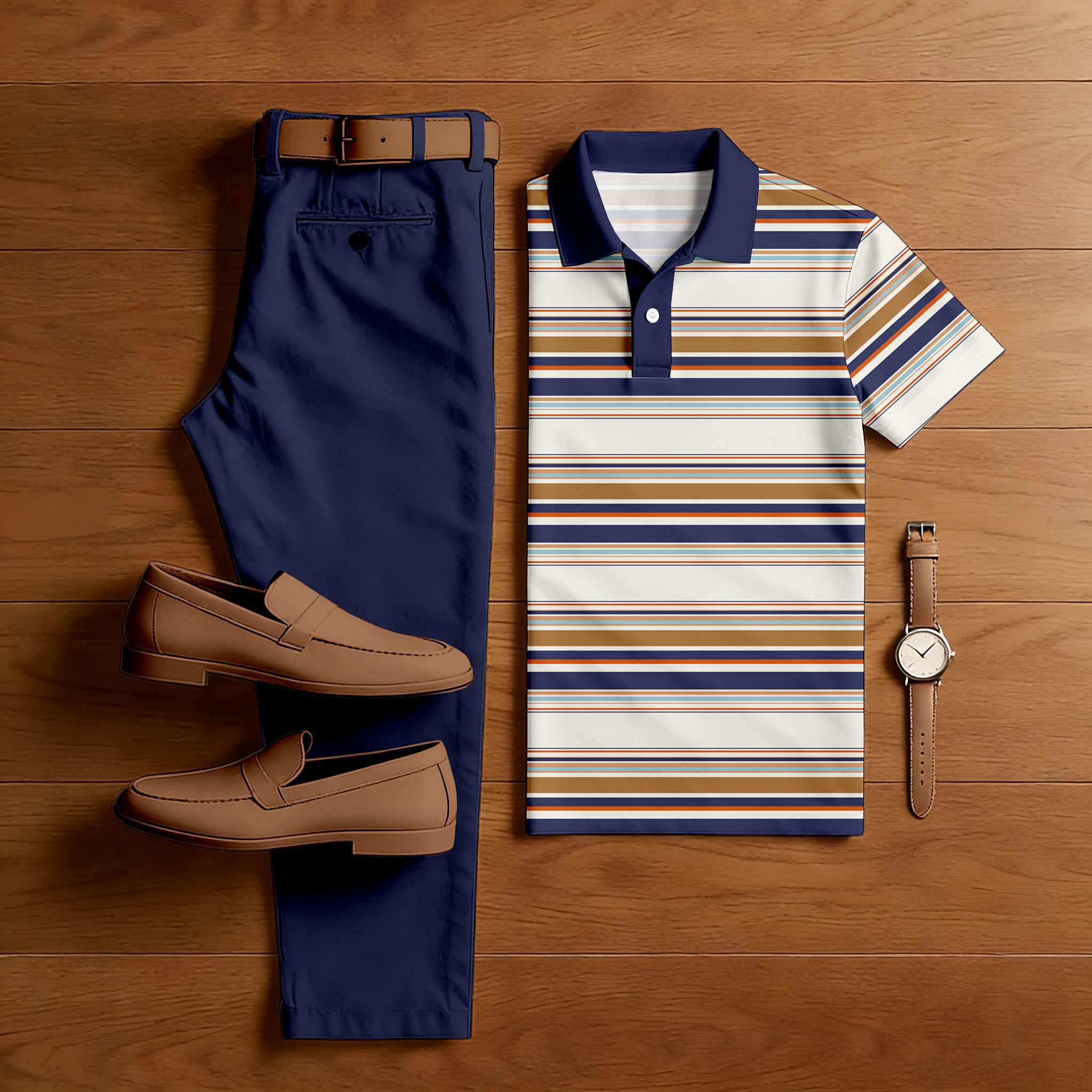 Men's Casual Navy Blue & Beige Color Matching Striped Printed Short Sleeved Polo Shirt & Trousers Two-Piece Set