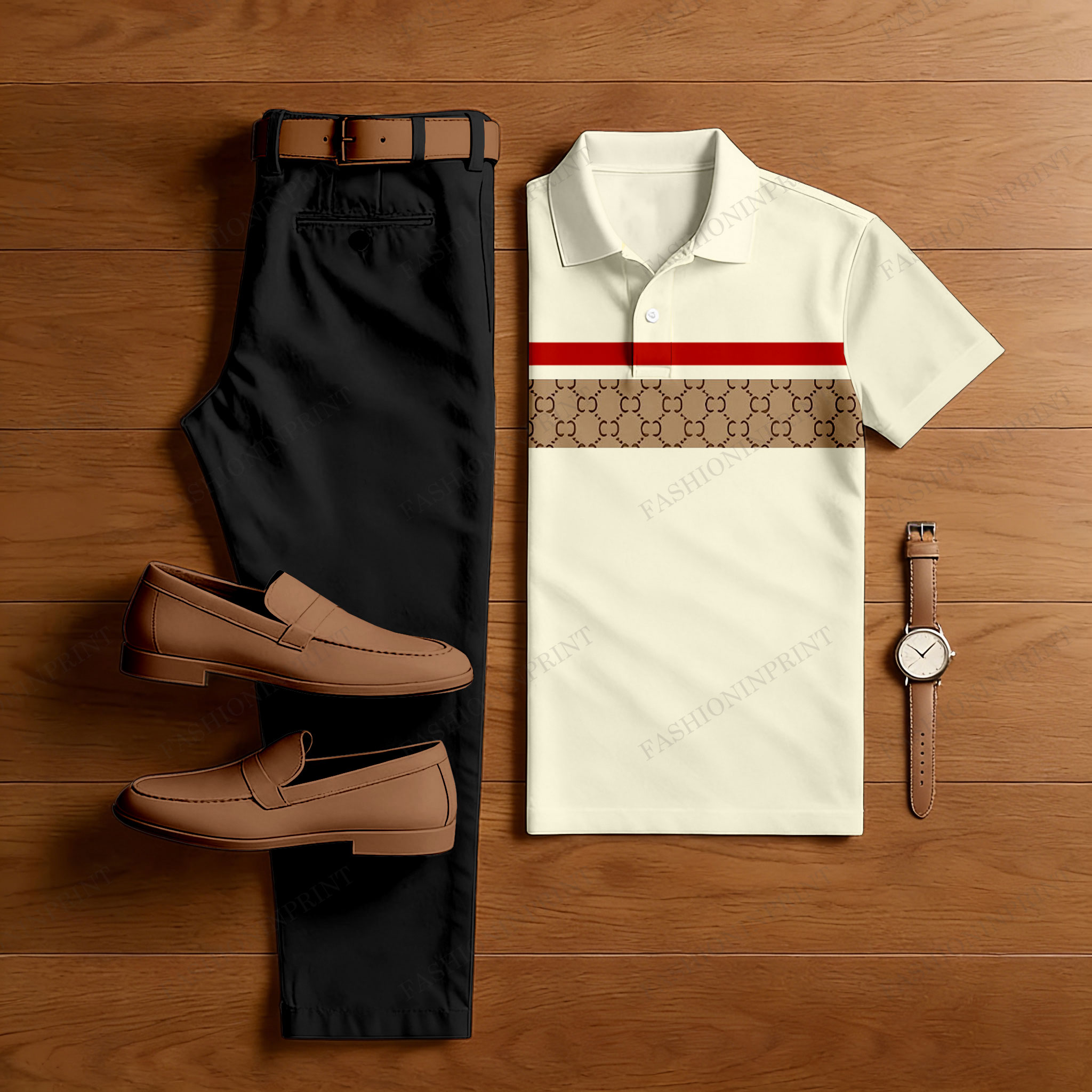 Men's Casual Off-White Checkered Printed Polo Shirt And Pants Two-Piece Set