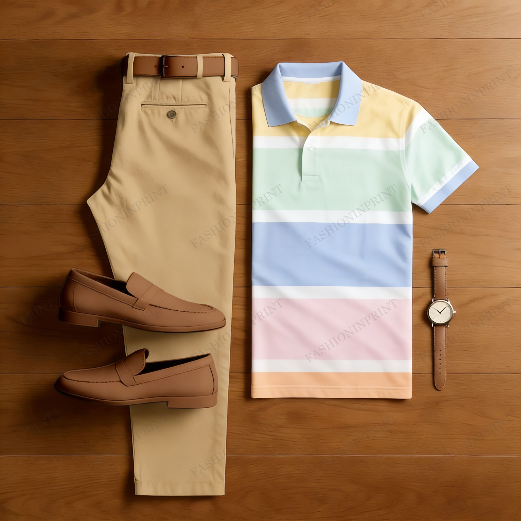 Men's Casual Colored Bars Printed Polo Shirt And Pants Two-Piece Set