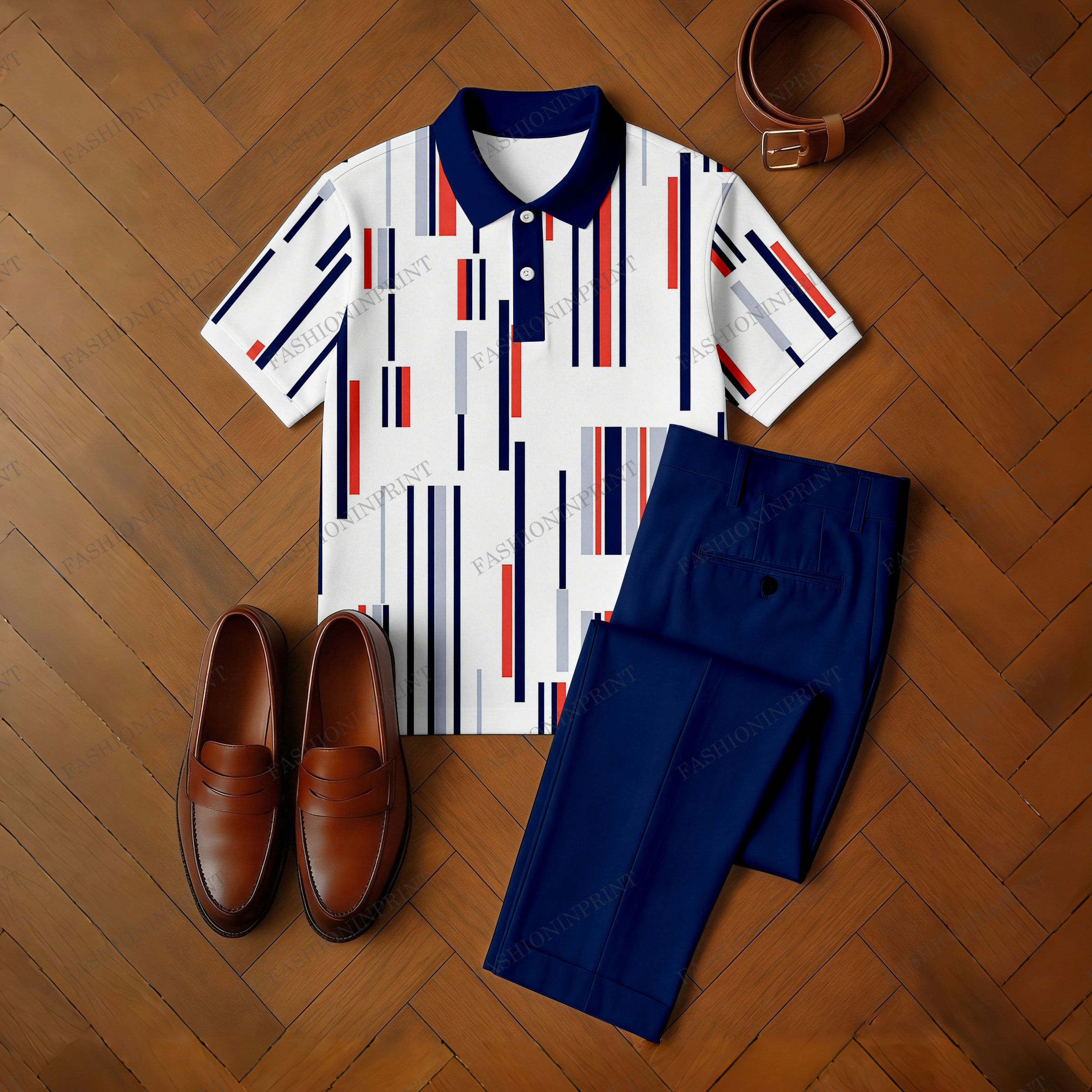 Men's Casual Royal Blue & White Color Matching Striped Printed Short Sleeved Polo Shirt & Trousers Two-Piece Set