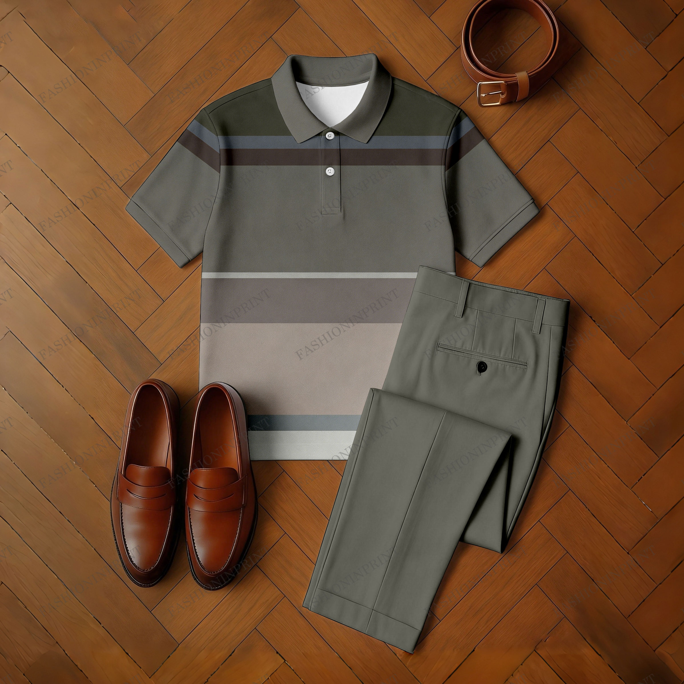 Men's Casual Dark Gray & Army Green Color Matching Striped Printed Short Sleeved Polo Shirt & Trousers Two-Piece Set