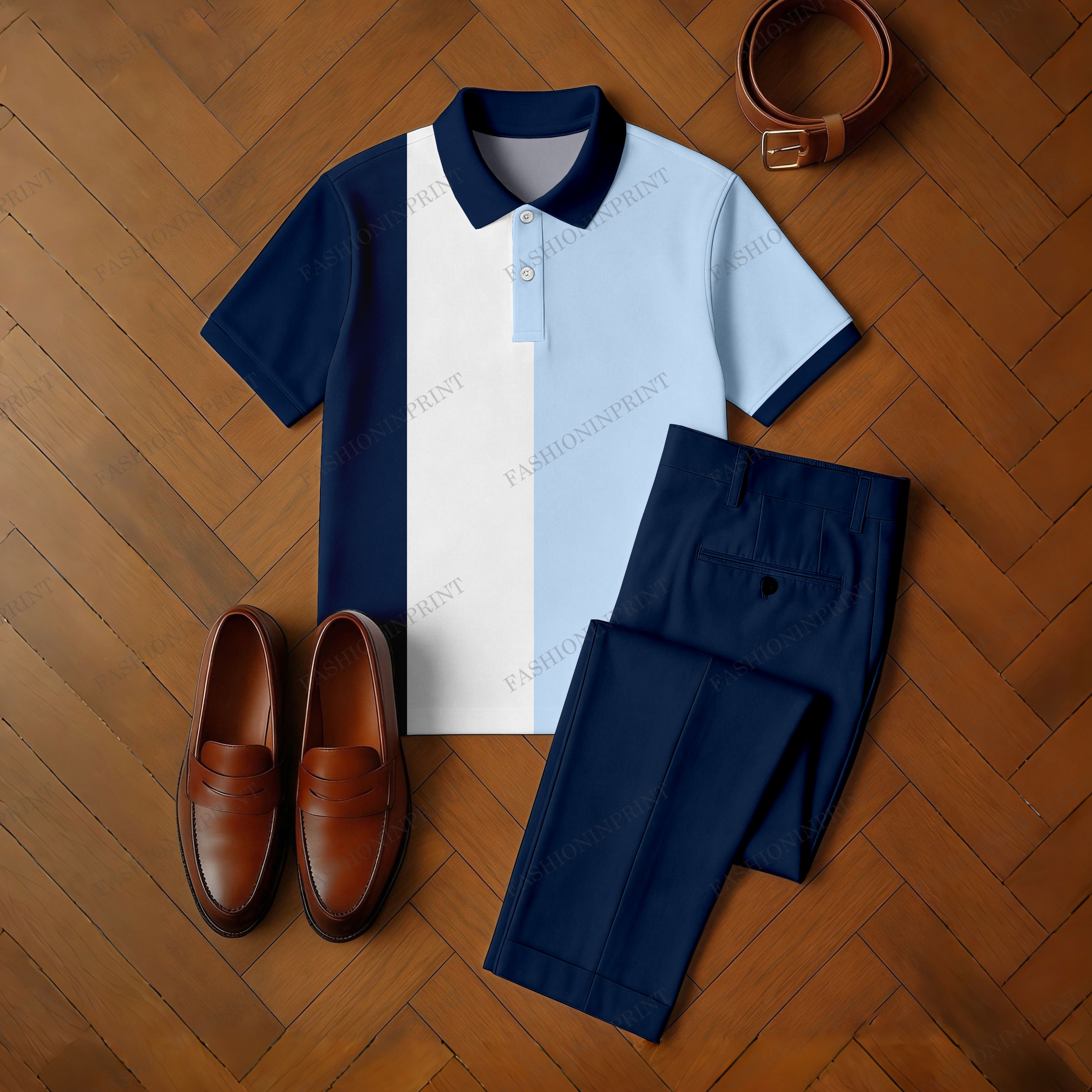 Men's Casual Navy Blue & White & Blue Color Matching Printed Short Sleeved Polo Shirt & Trousers Two-Piece Set