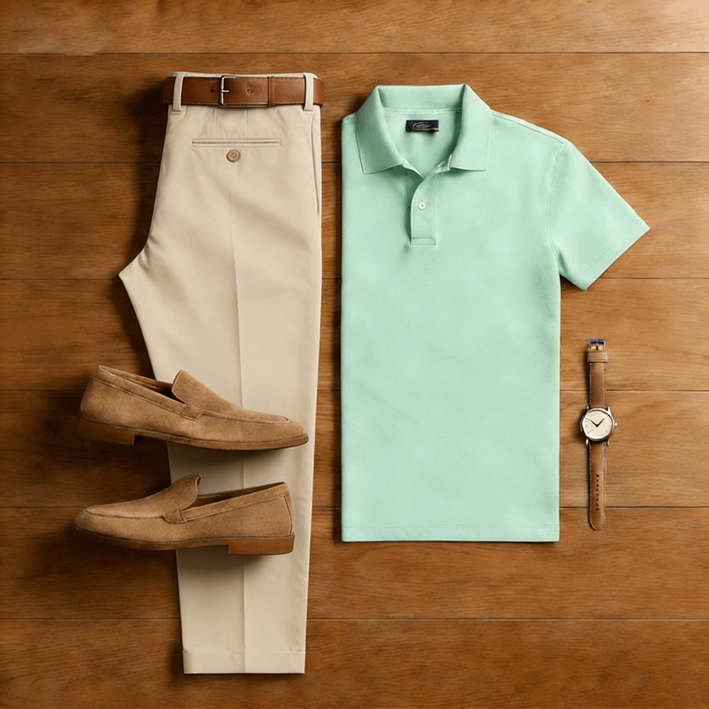 Men's Casual Green & Khaki Solid Color Matching Short Sleeved Polo Shirt & Trousers Two-Piece Set
