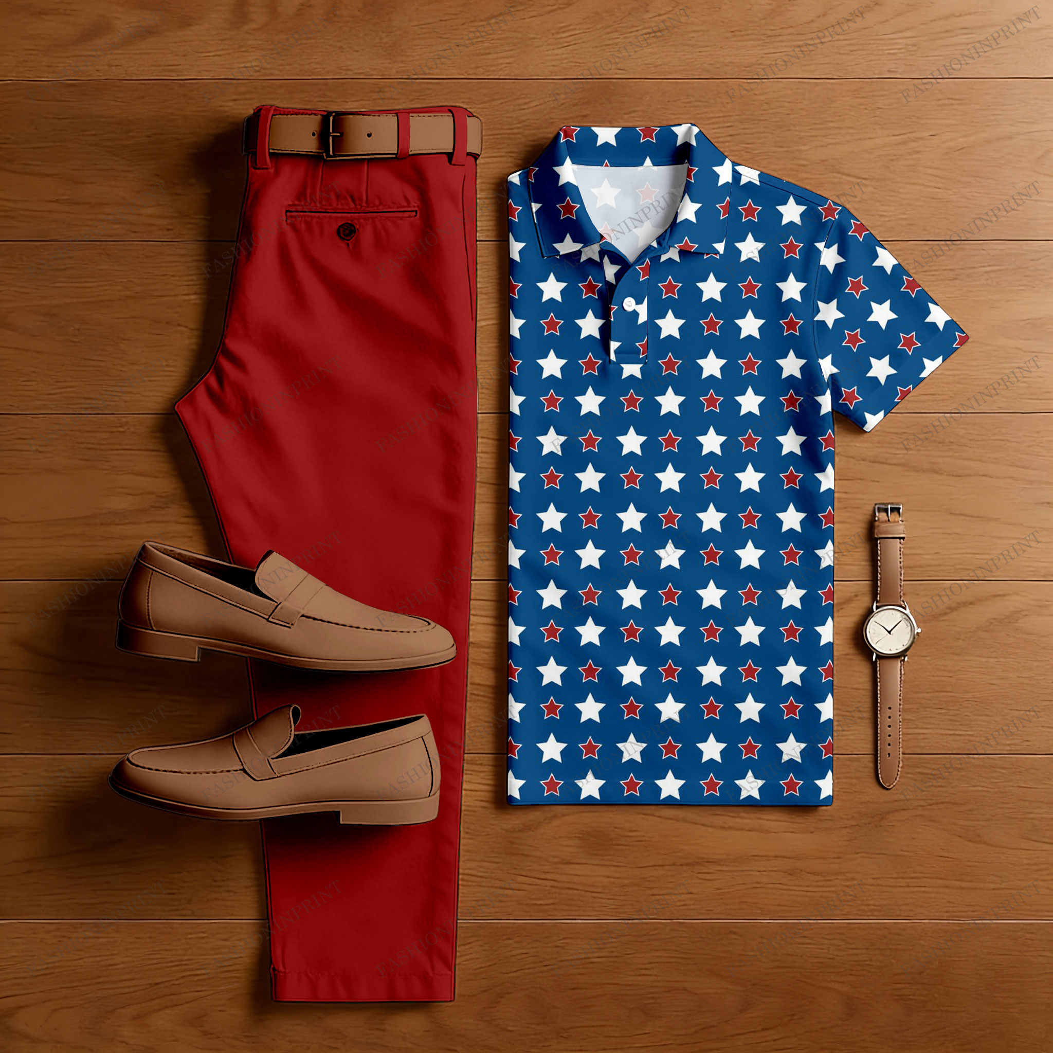 Men's Casual Red & Royal Blue Color Matching Star Printed Short Sleeved Polo Shirt & Trousers Two-Piece Set