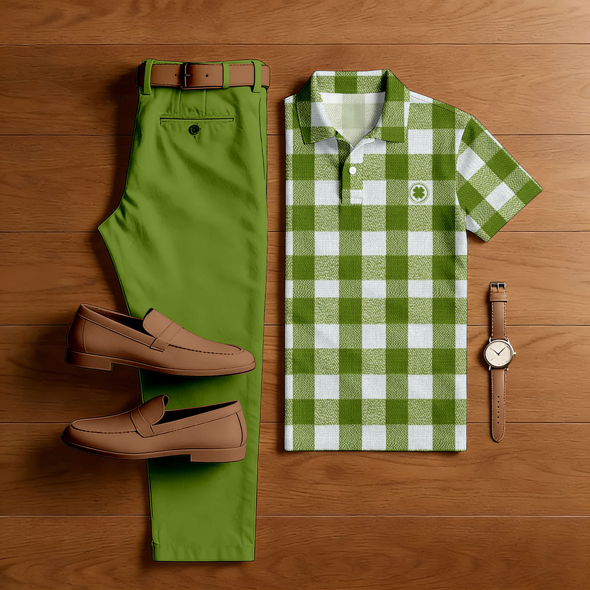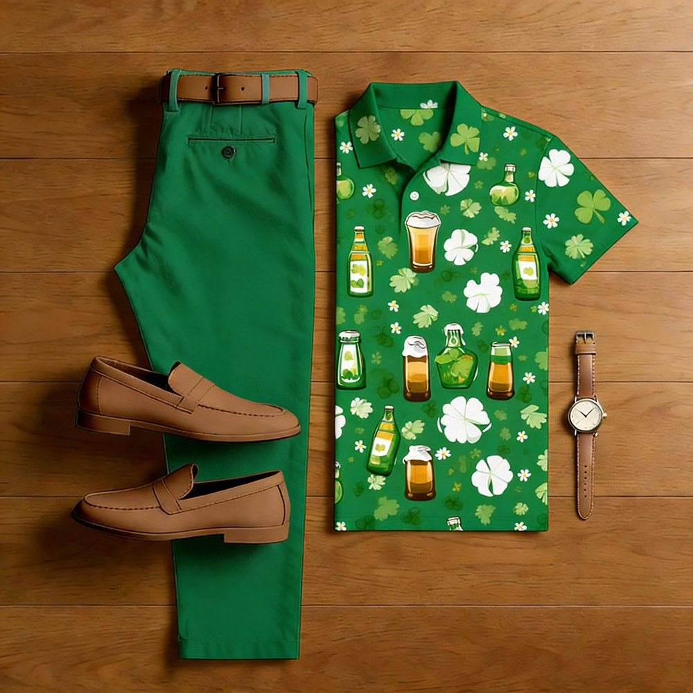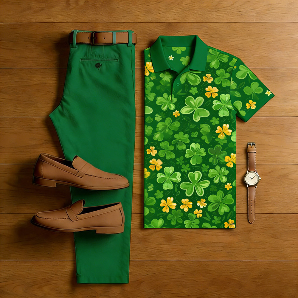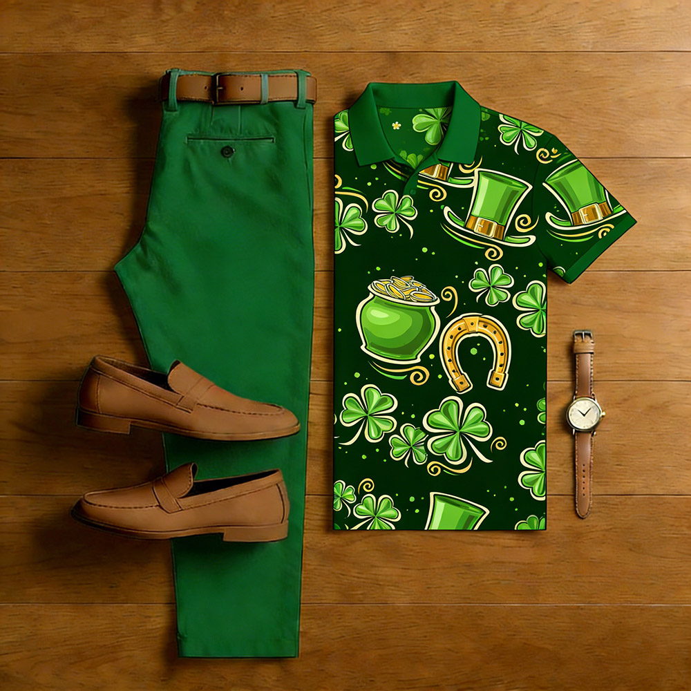 Men's Casual Green Color Matching St. Patrick's Day Checkered Printed Short Sleeved Polo Shirt & Trousers Two-Piece Set