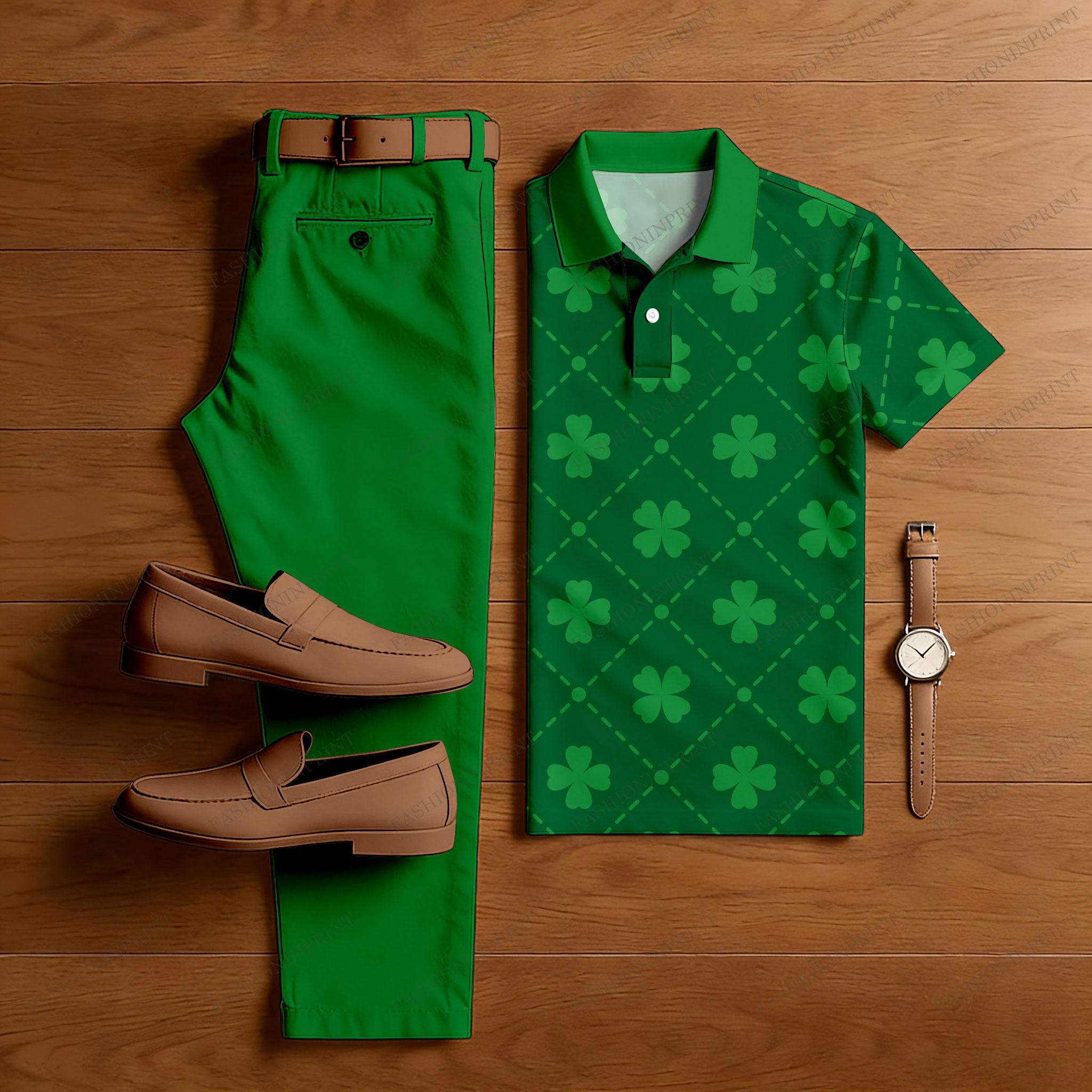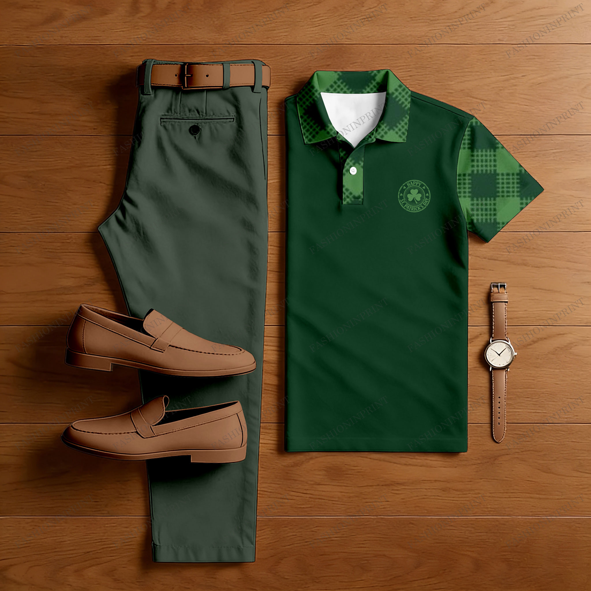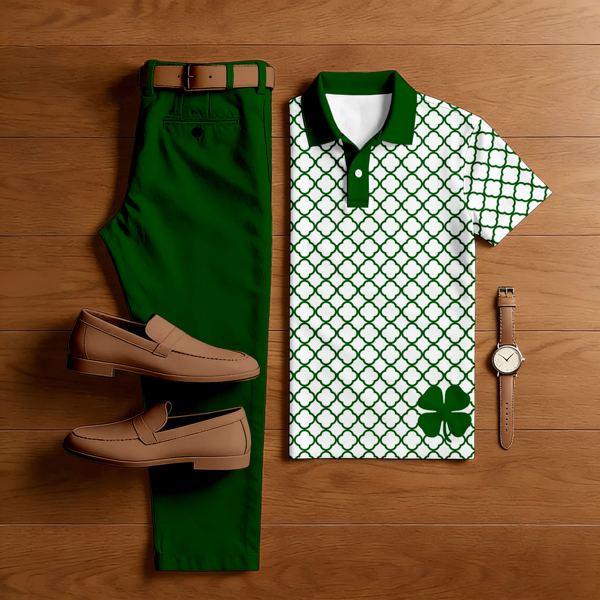 Men's Casual Green Color Matching St. Patrick's Day Checkered Printed Short Sleeved Polo Shirt & Trousers Two-Piece Set