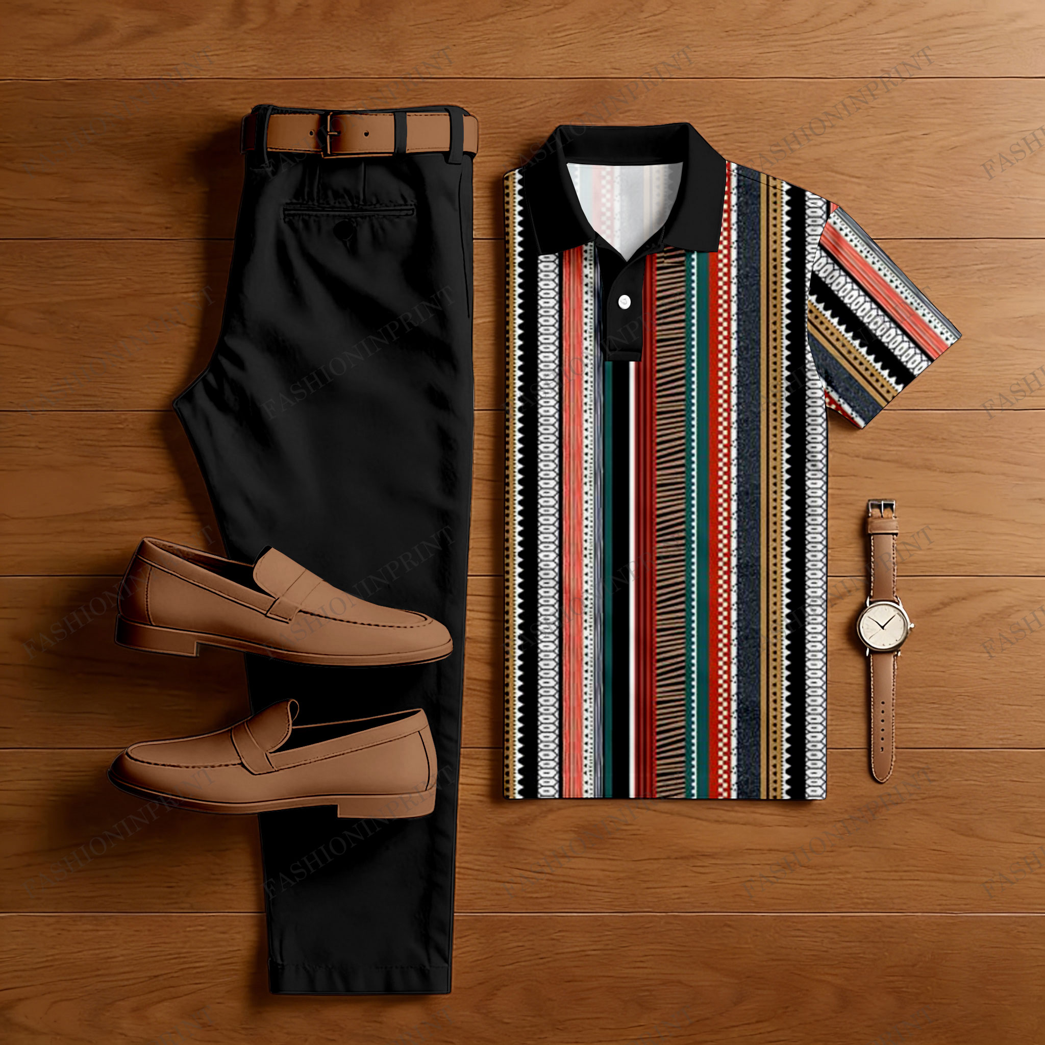 Men's Casual Black & Multi Color Matching Retro Style Printed Short Sleeved Polo Shirt & Trousers Two-Piece Set