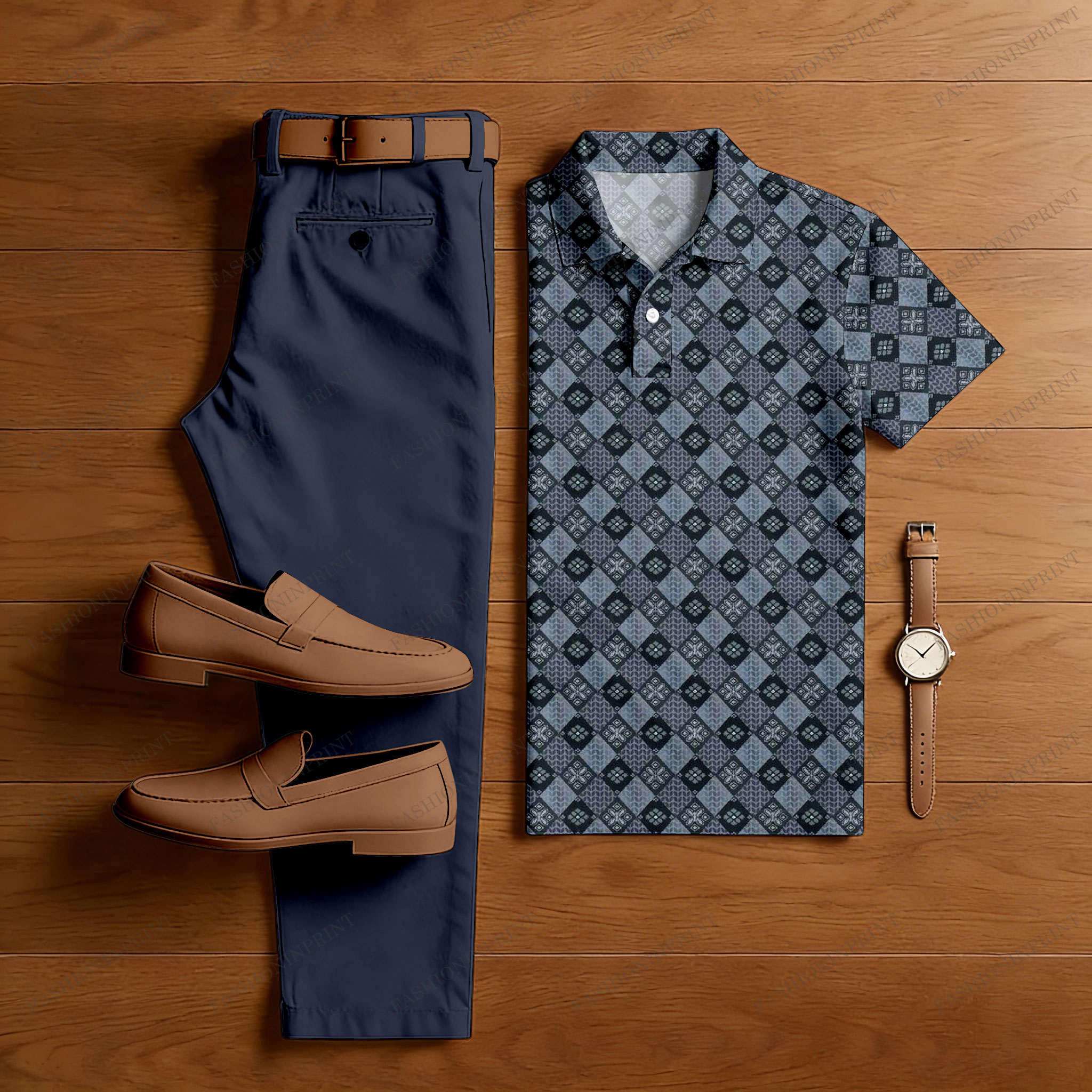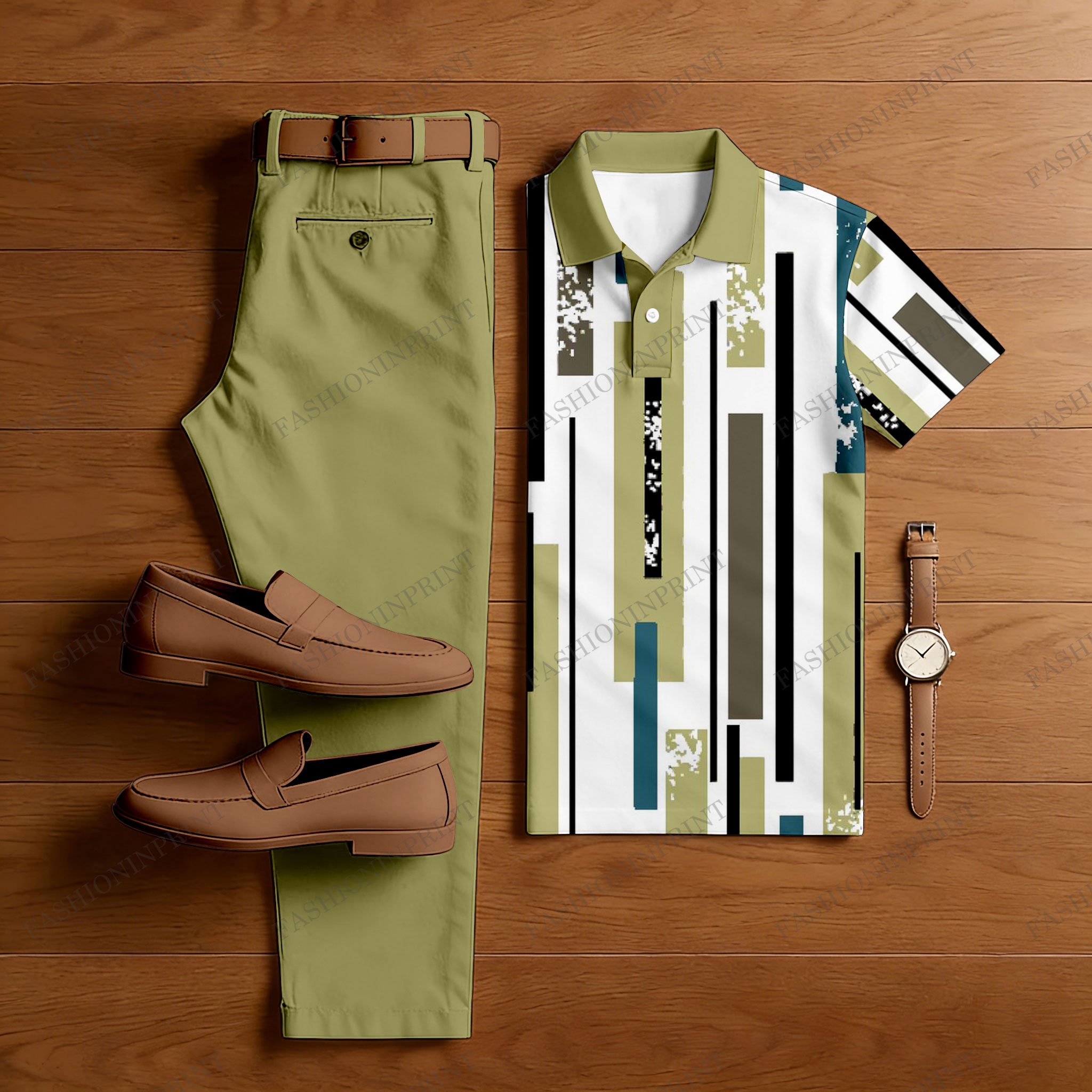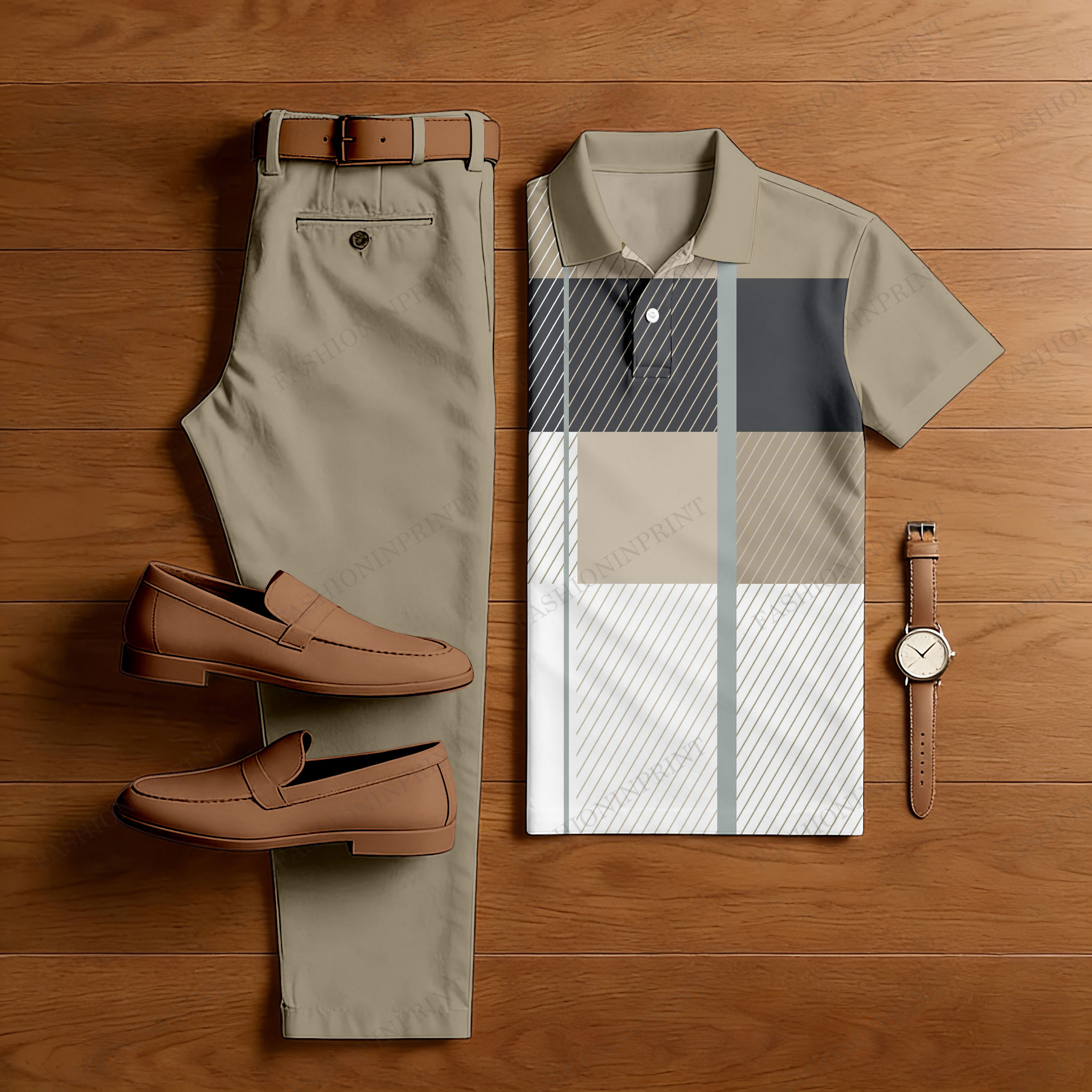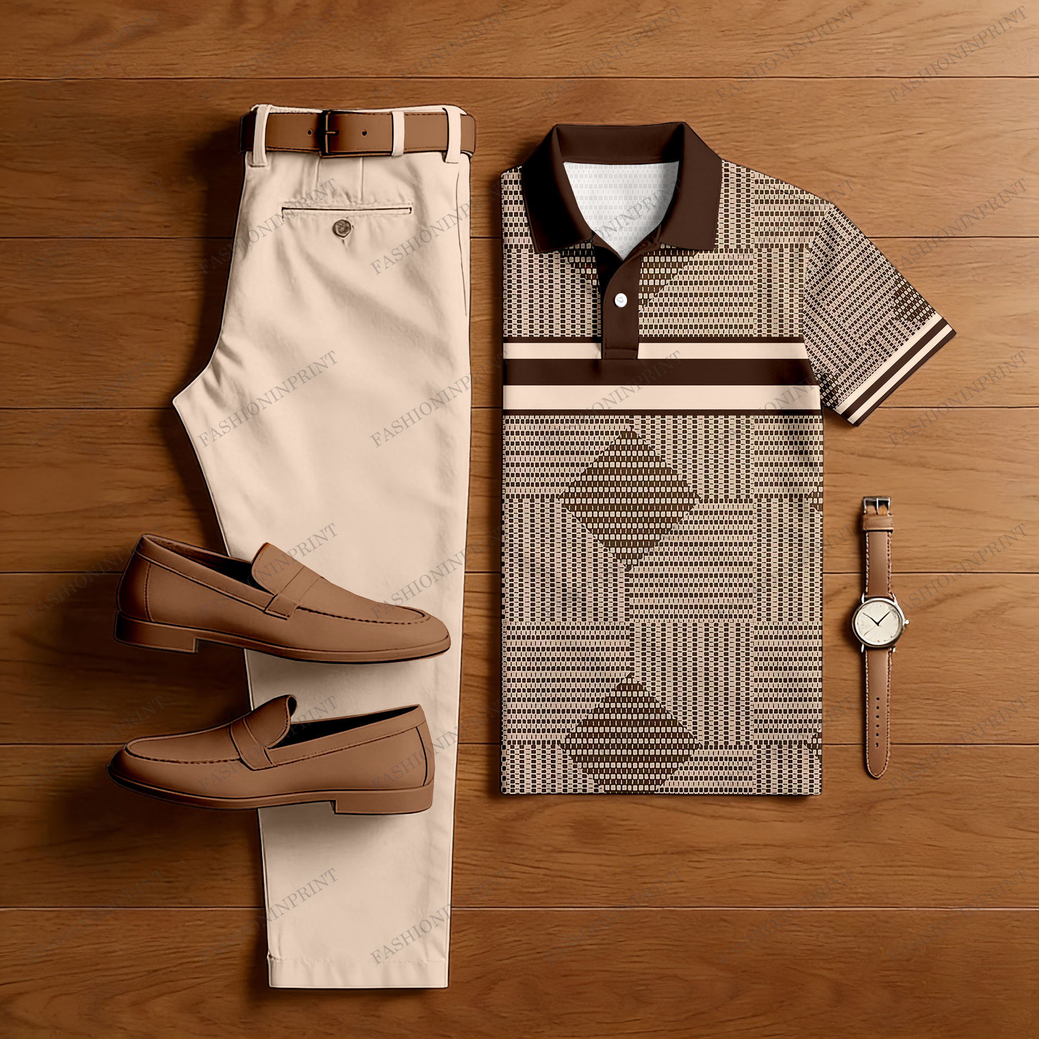 Men's Casual Khaki & Beige Color Matching Geometric Printed Short Sleeved Polo Shirt & Trousers Two-Piece Set