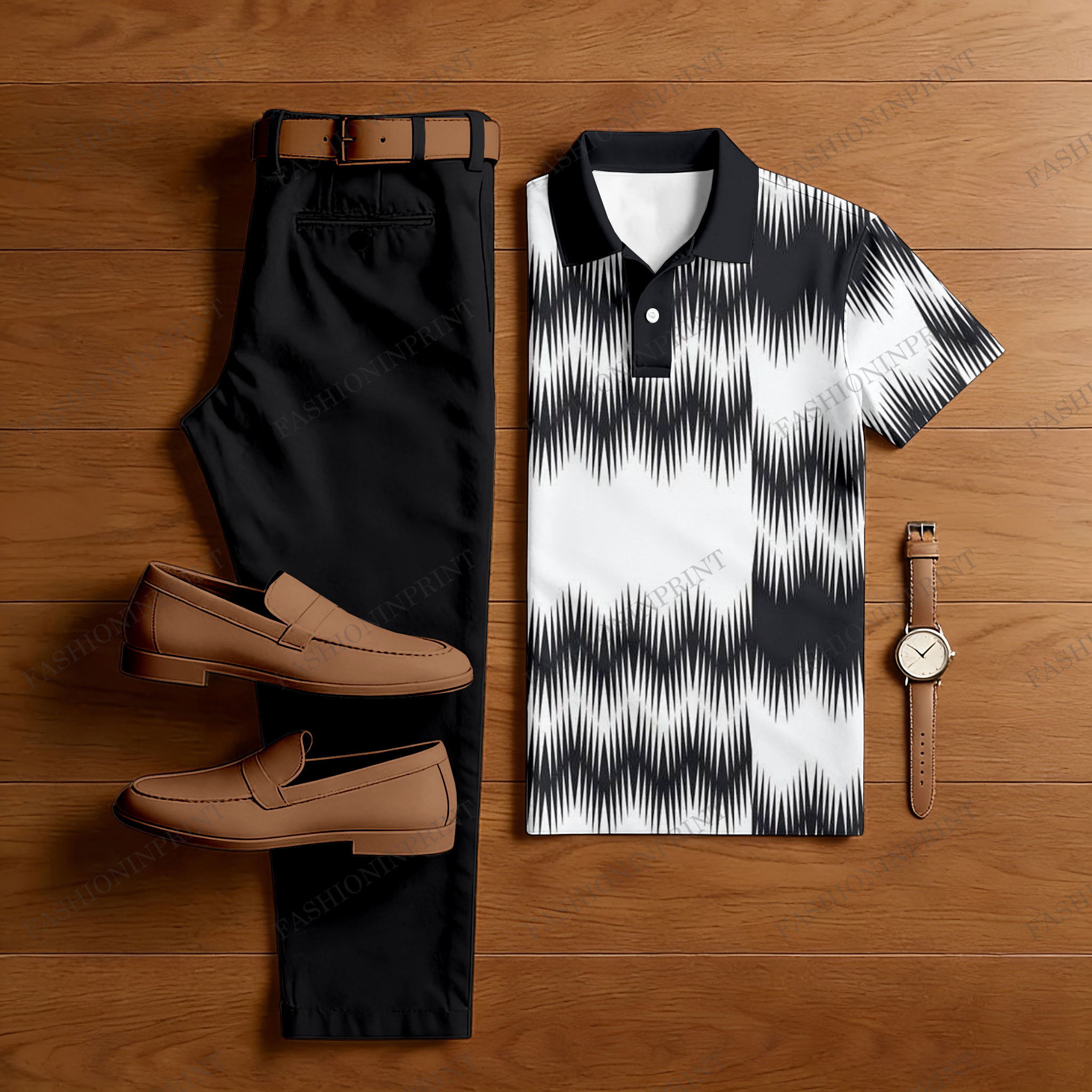 Men's Casual Black & White Color Matching Printed Short Sleeved Polo Shirt & Trousers Two-Piece Set