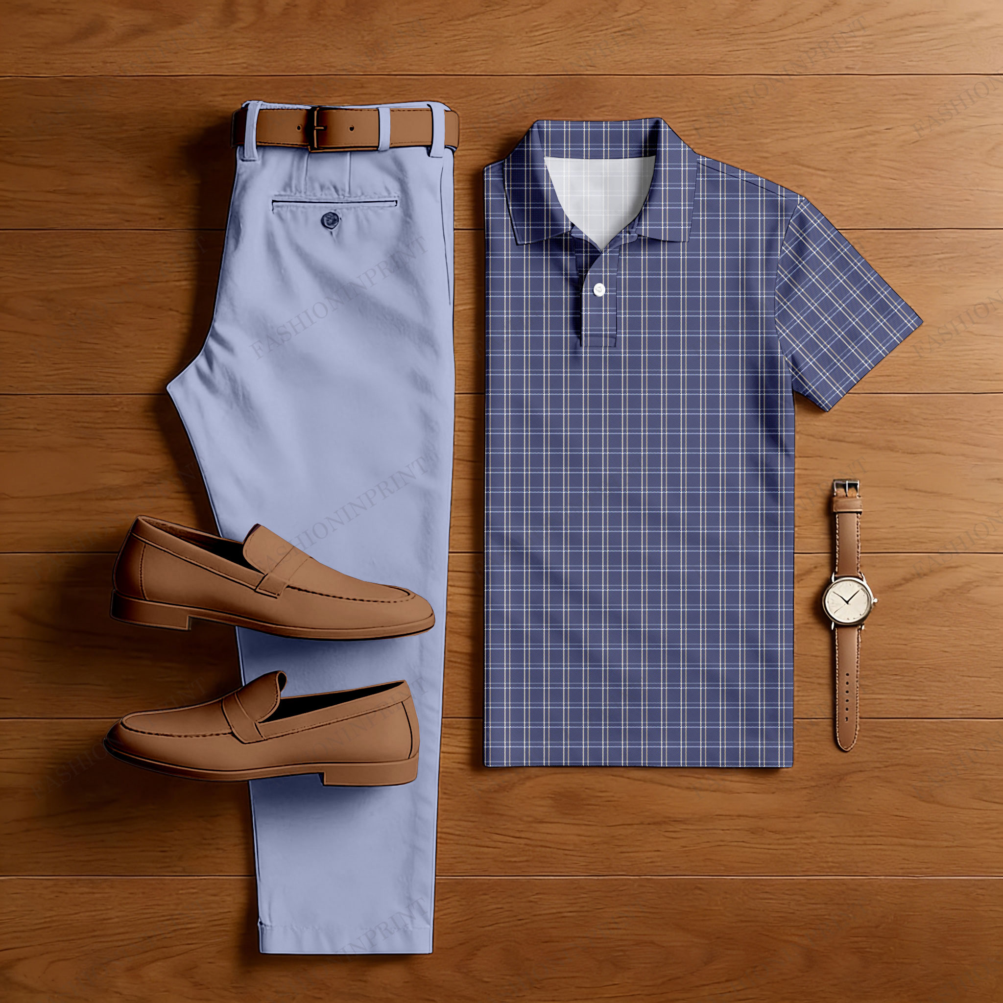 Men's Casual Blue & Purple Color Matching Checkered Printed Short Sleeved Polo Shirt & Trousers Two-Piece Set