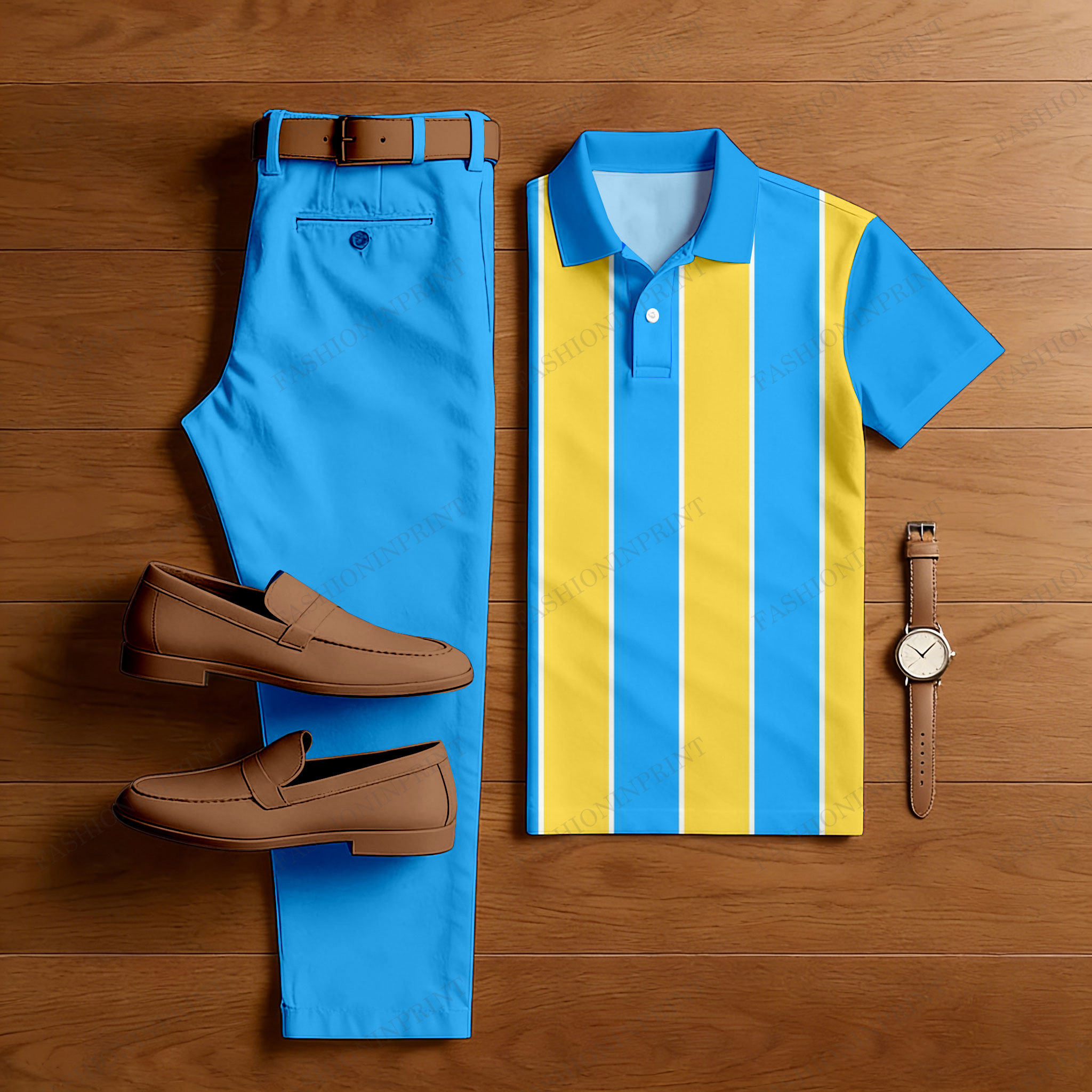 Men's Casual Blue & Yellow Color Matching Striped Printed Short Sleeved Polo Shirt & Trousers Two-Piece Set